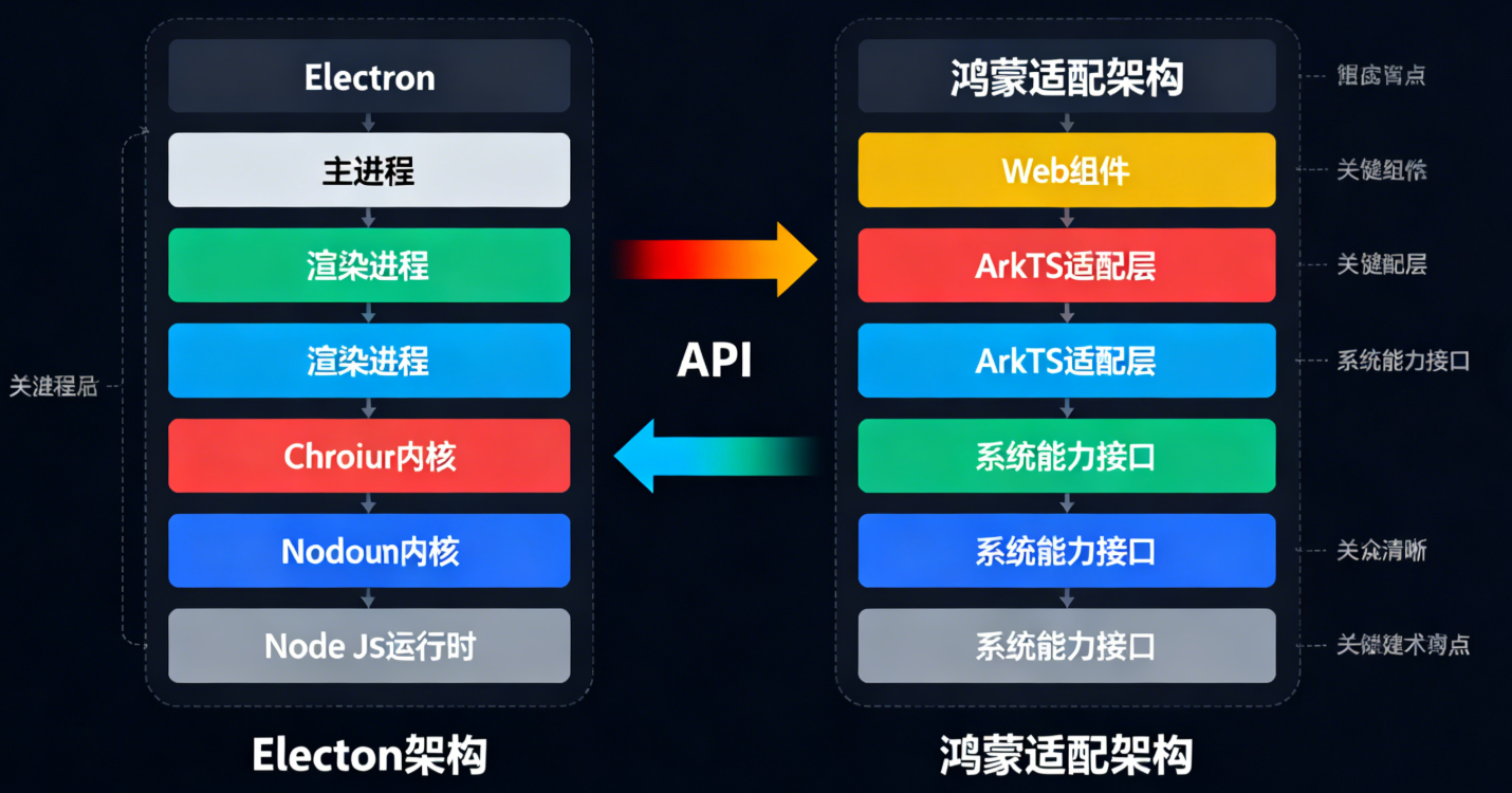 Electron 与鸿蒙的底层架构存在本质区别,这决定了适配并非简单移植,而是基于鸿蒙生态的重构: