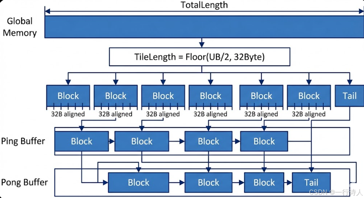 $$\text{MaxElements} = \frac{\text{UbSize}}{2 \times \text{sizeof(T)}}$$$$\text{TileLength} = \lfloor \frac{\text{MaxElements}}{16} \rfloor \times 16 \quad (\text{针对FP16})$$