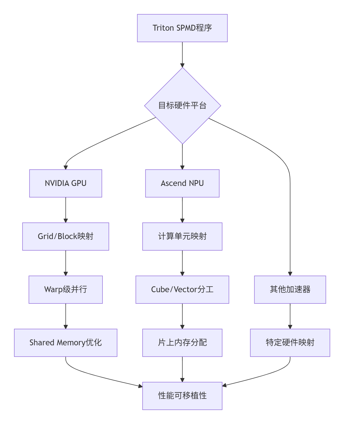 单程序多数据(SPMD)模型是Triton硬件无关性的核心,但其在不同硬件上的实现策略各异: