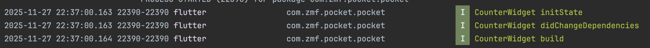 打开包含此组件的页面,可以看到,在StatefulWidget插入到 widget 树时首先initState方法会被调用。