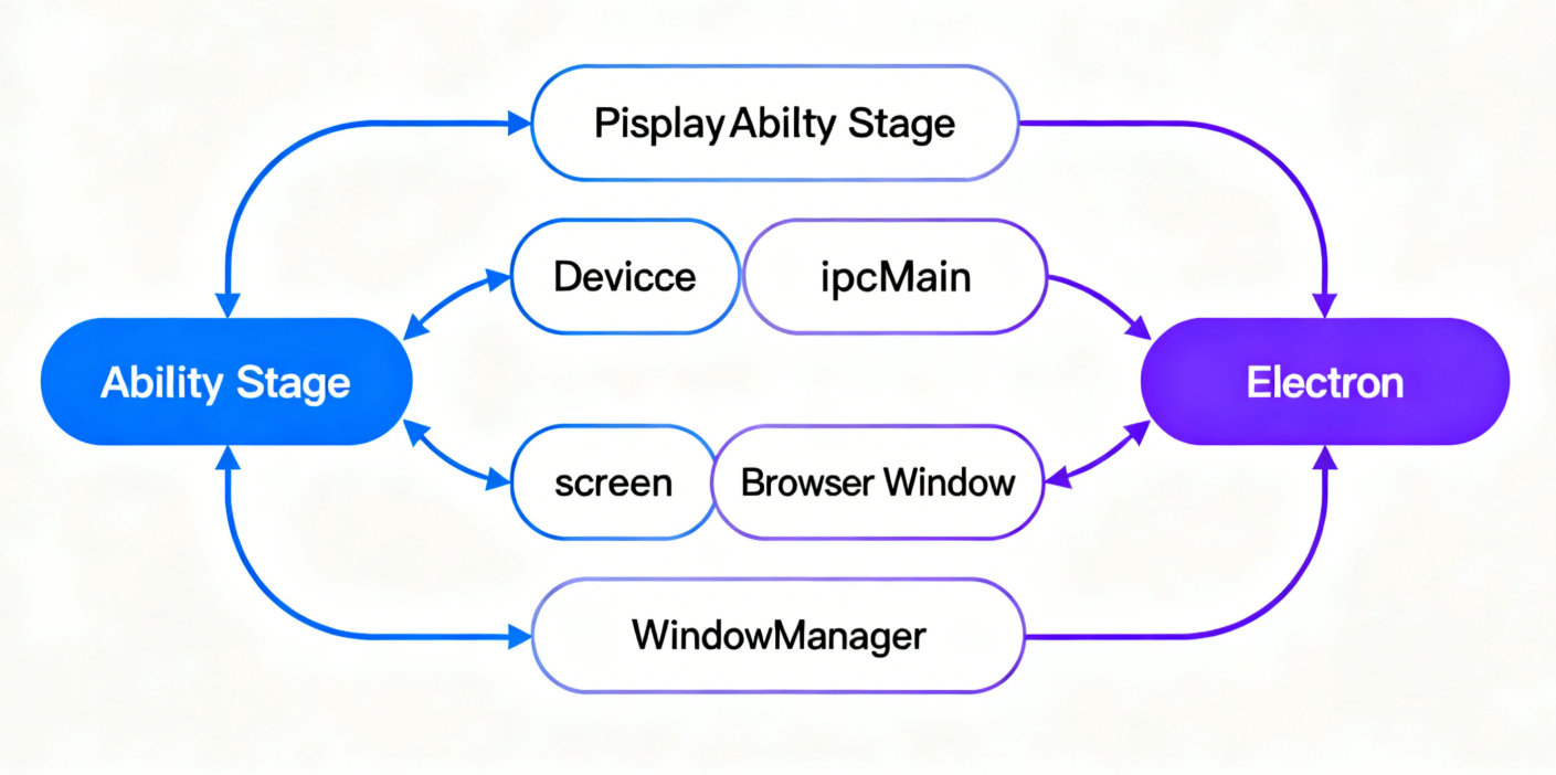 - 设备特性感知:通过鸿蒙 API 与 Electron 模块获取设备类型、分辨率、屏幕方向等信息,动态调整布局与功能;