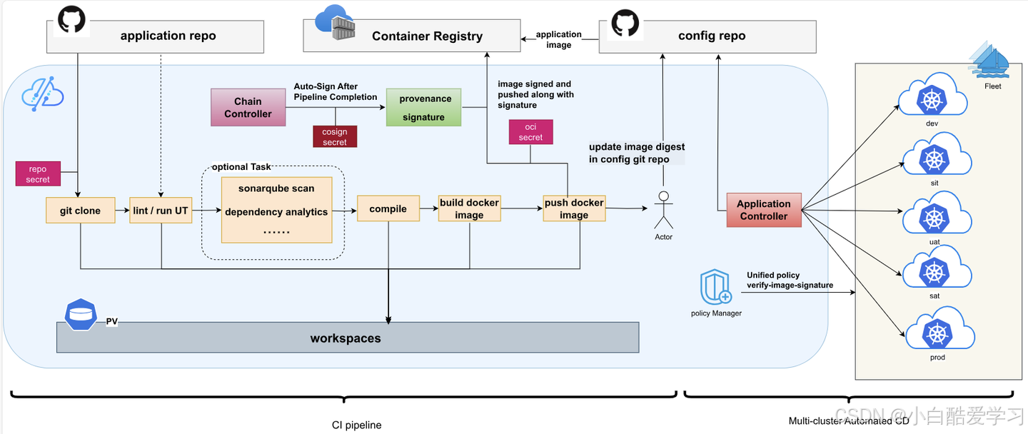 git-clone、go-test、go-lint、build-and-push-image等任务模板,开发者只要进行组装; - 往下连接统一应用分发,多集群部署;