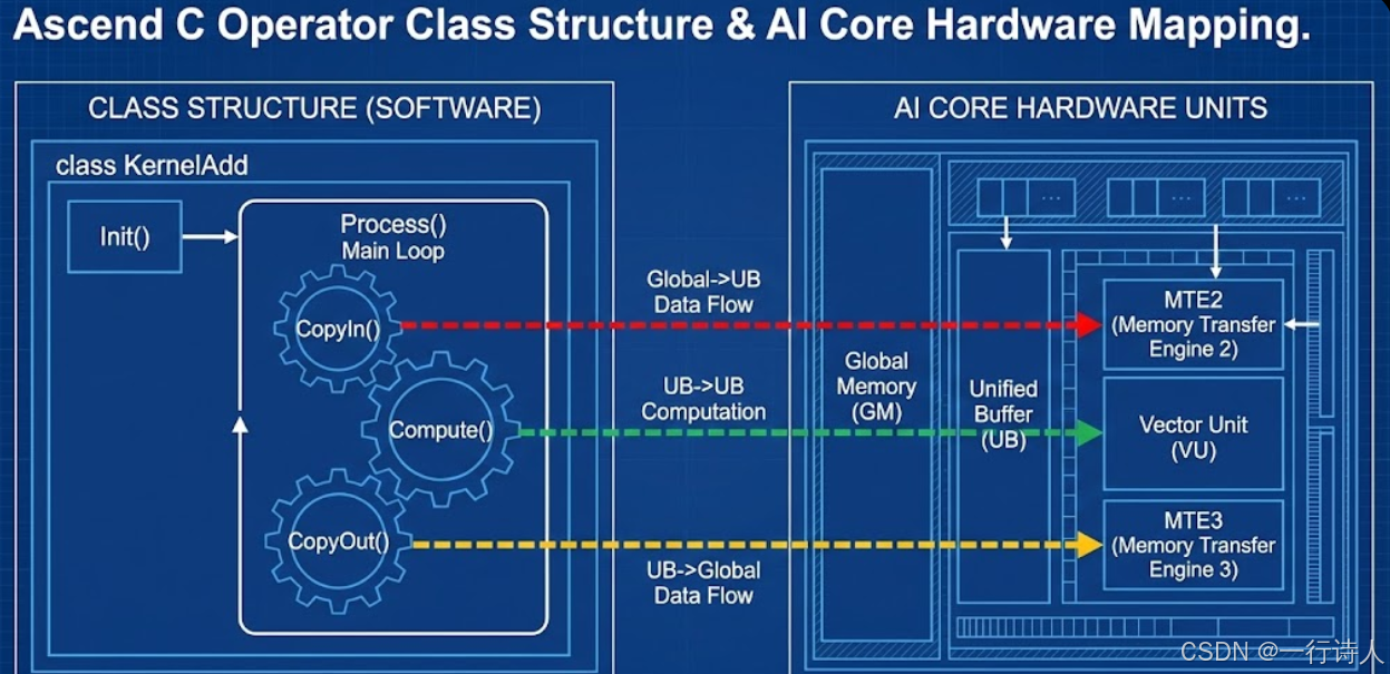 2025年昇腾CANN训练营第二季推出0基础入门、开发者案例等课程,助力开发者提升算子开发技能。本文以官方VectorAdd算子为例,深度解析AscendC开发范式。文章剖析了标准算子类的结构,包括初始化函数、核心处理函数和三级流水线设计,详细讲解了内存管理、队列通信等关键技术点。通过分析Init、Process、CopyIn、Compute、CopyOut等核心函数,总结出AscendC开发的三