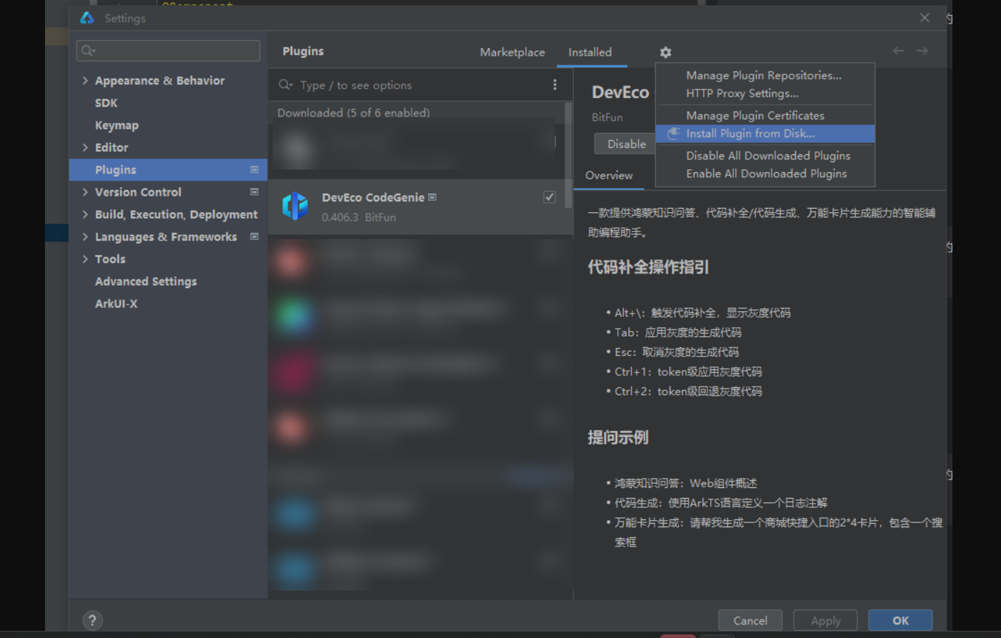 插件安装完成后,需确认启用状态,DevEco Studio插件管理界面如下: