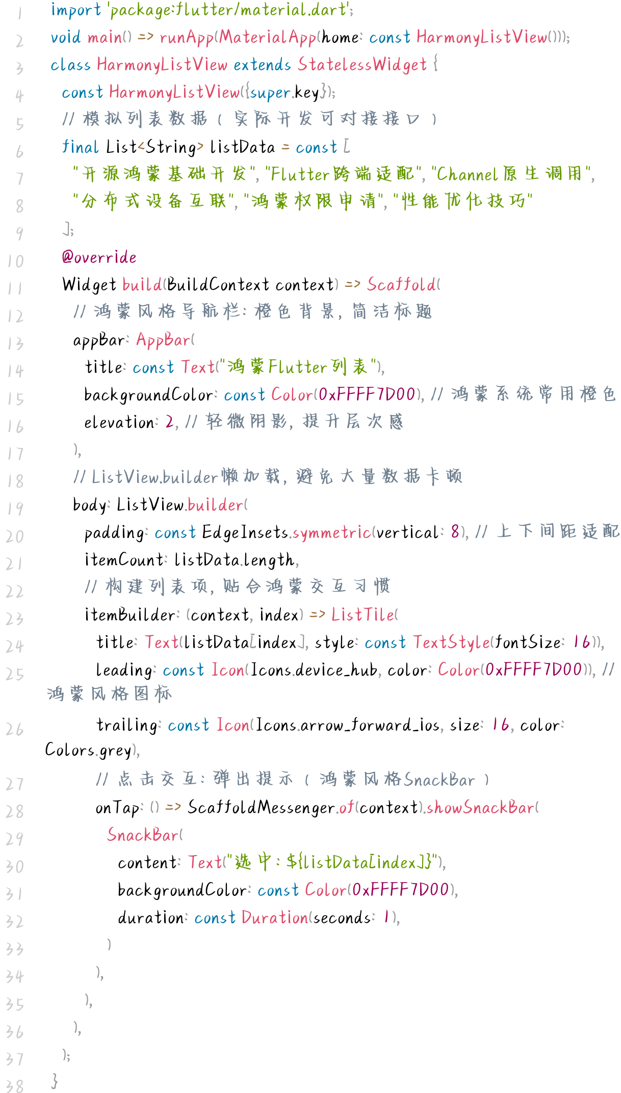 - 性能优化:采用 ListView.builder 懒加载模式,仅渲染当前可见列表项,即使数据量达千条,鸿蒙设备运行仍流畅;