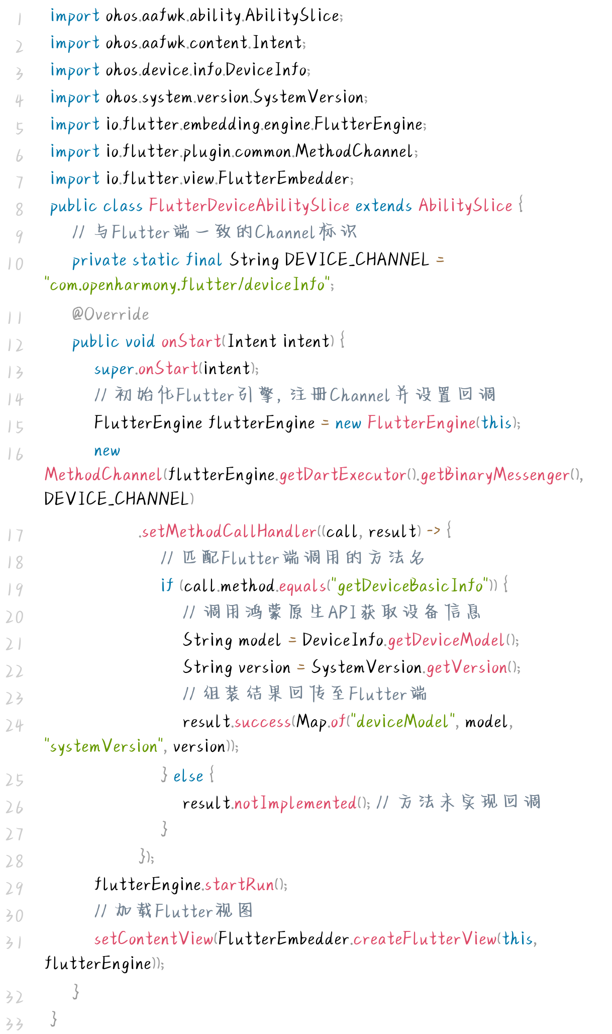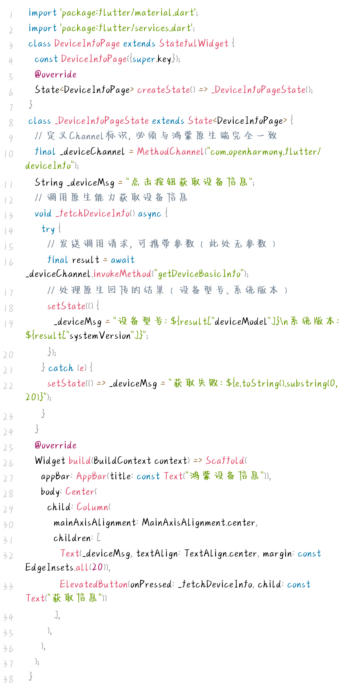 - 能力通信层:通过「Harmony Channel」作为双向通信桥梁,Flutter端可主动调用鸿蒙原生能力(如设备信息获取、分布式互联、权限申请等),原生端也能向Flutter端推送事件(如设备状态变化、消息通知等),通信延迟低至毫秒级;