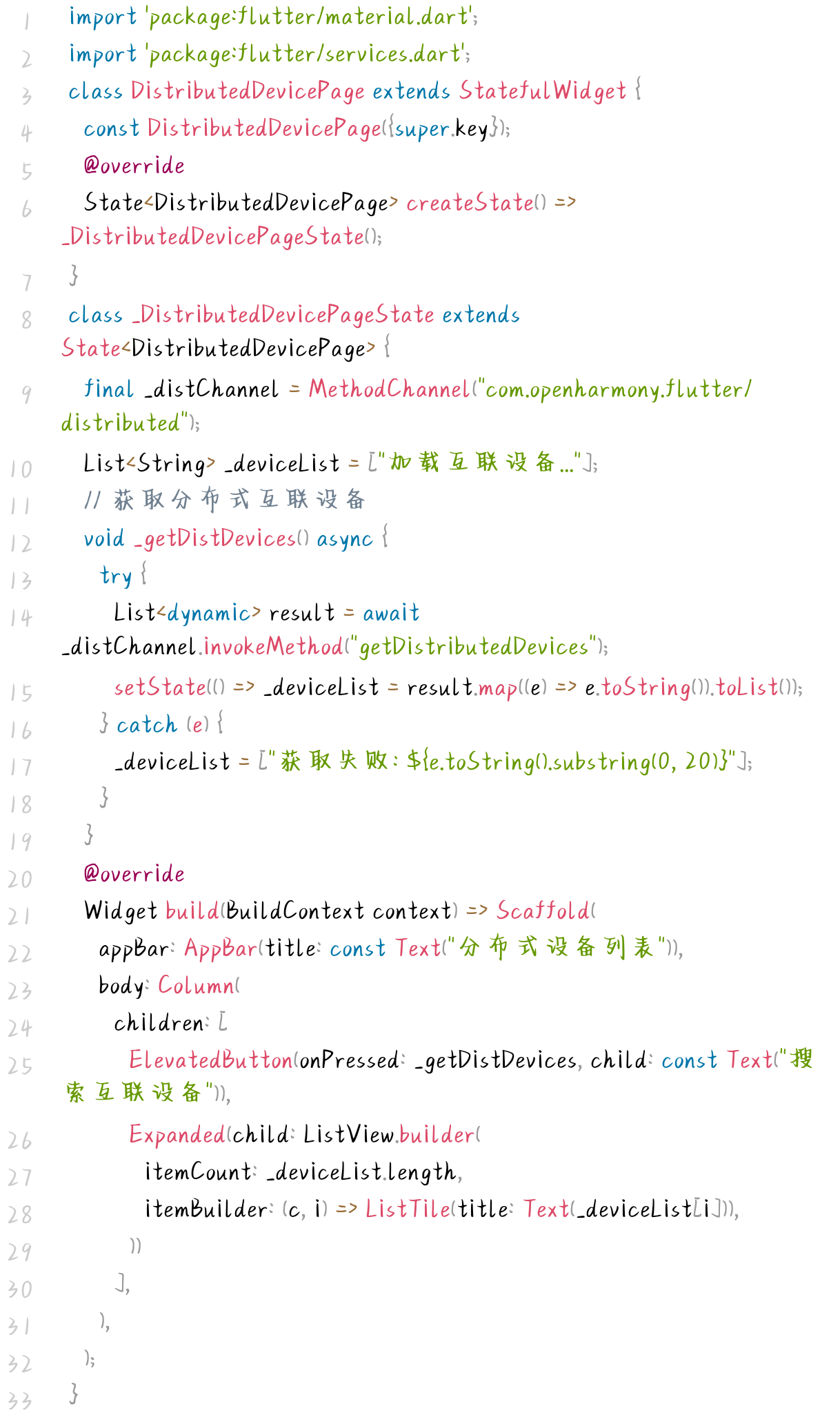 借助鸿蒙分布式软总线能力,通过Channel调用原生分布式API,获取同一账号下的互联设备列表,Flutter端仅需少量代码即可实现设备联动基础功能。