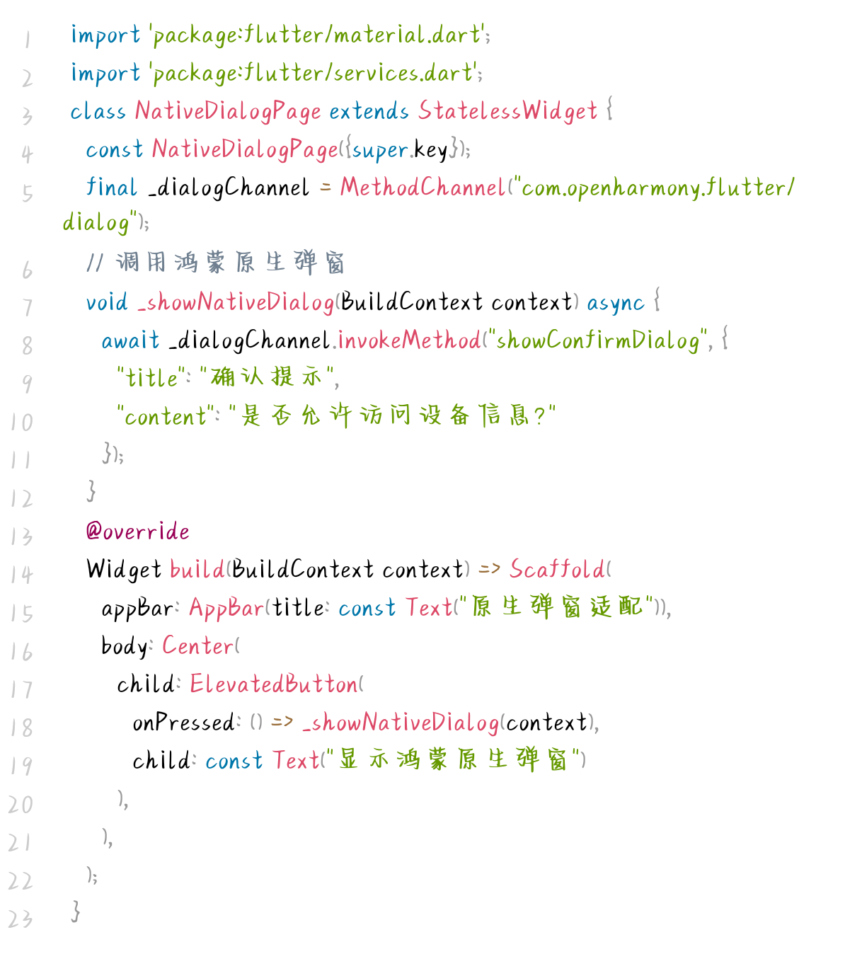 部分场景需使用鸿蒙原生弹窗(如权限申请提示、重要信息确认),通过Channel调用原生弹窗组件,保持与系统交互风格一致。