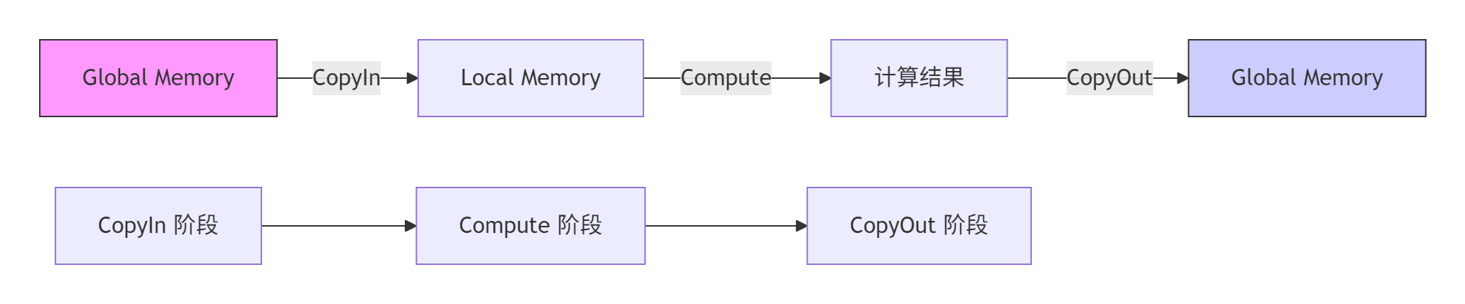 Ascend C的核心创新在于将算子处理流程抽象为三级流水线:CopyIn、Compute、CopyOut,通过队列机制实现并行执行。