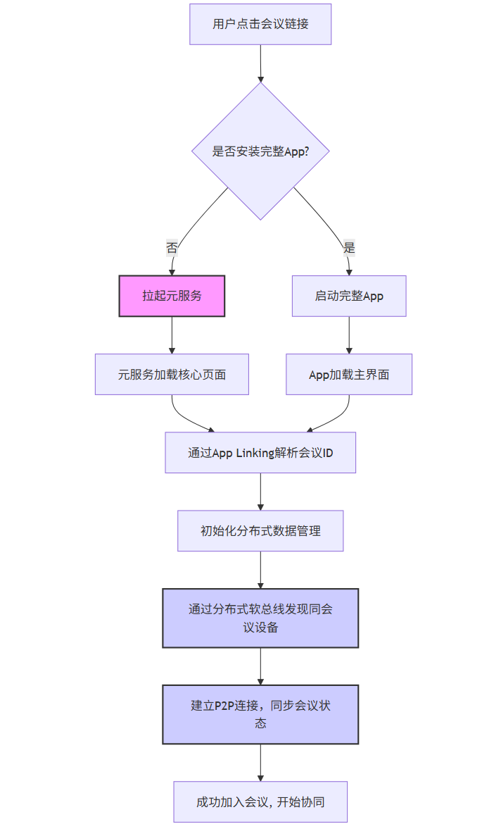 为了让读者更直观地理解,我们用 Mermaid 流程图来描绘用户从点击会议链接到成功入会的核心流程,其中融合了元服务、分布式软总线等关键技术点。