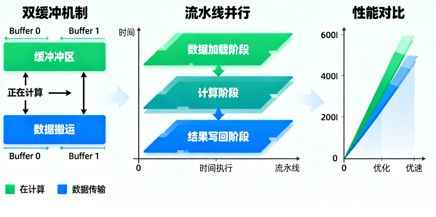 流水线并行:将计算过程分解为多个阶段(数据搬运、计算、结果写回),各阶段重叠执行。