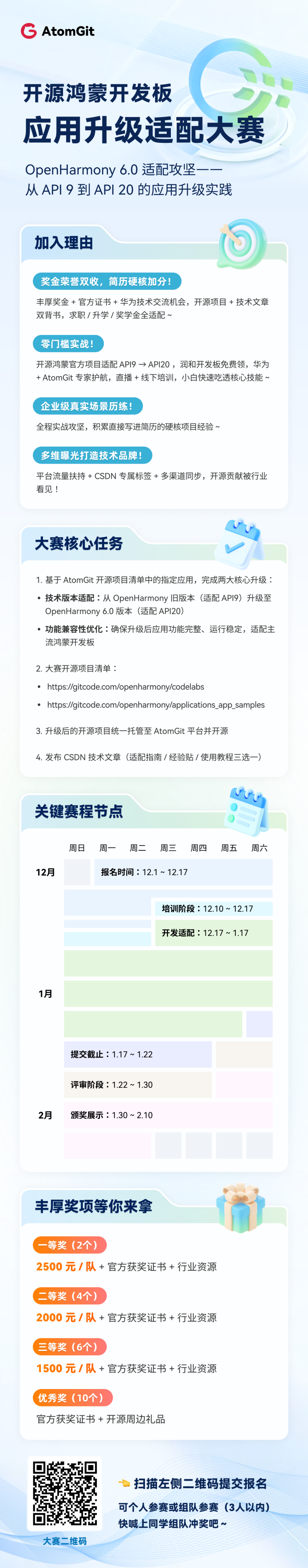还在愁简历缺硬核项目?想入门鸿蒙生态却没实操机会?现在机会来了 —— 由 AtomGit 联合开源鸿蒙项目群教育工作组重磅推出的「开源鸿蒙开发板应用升级适配大赛」正式启动!面向计算机、软件工程等相关专业本科生 / 研究生,零门槛参赛,组队就能冲击奖金 + 官方证书,解锁鸿蒙生态实战履历!
