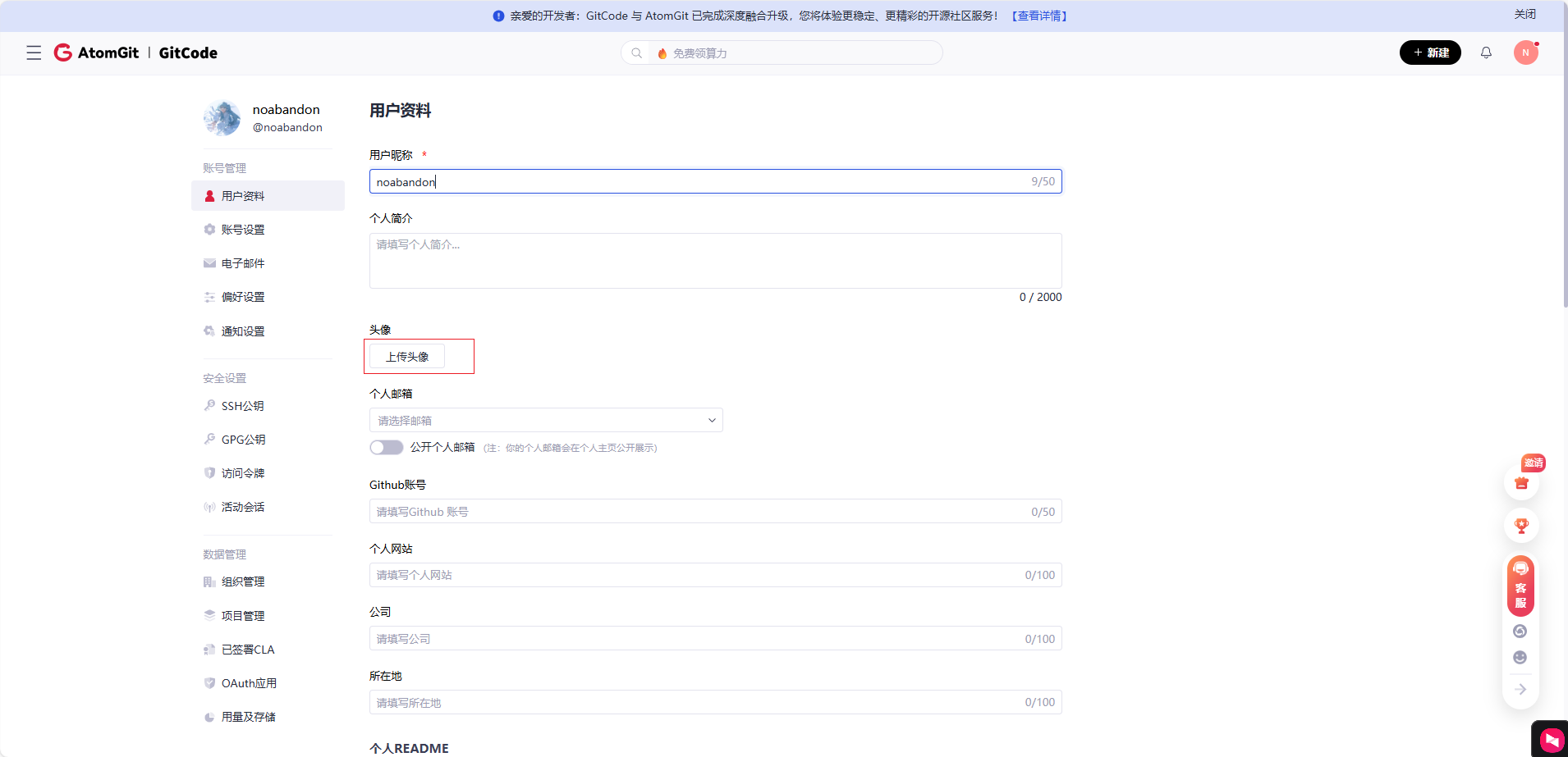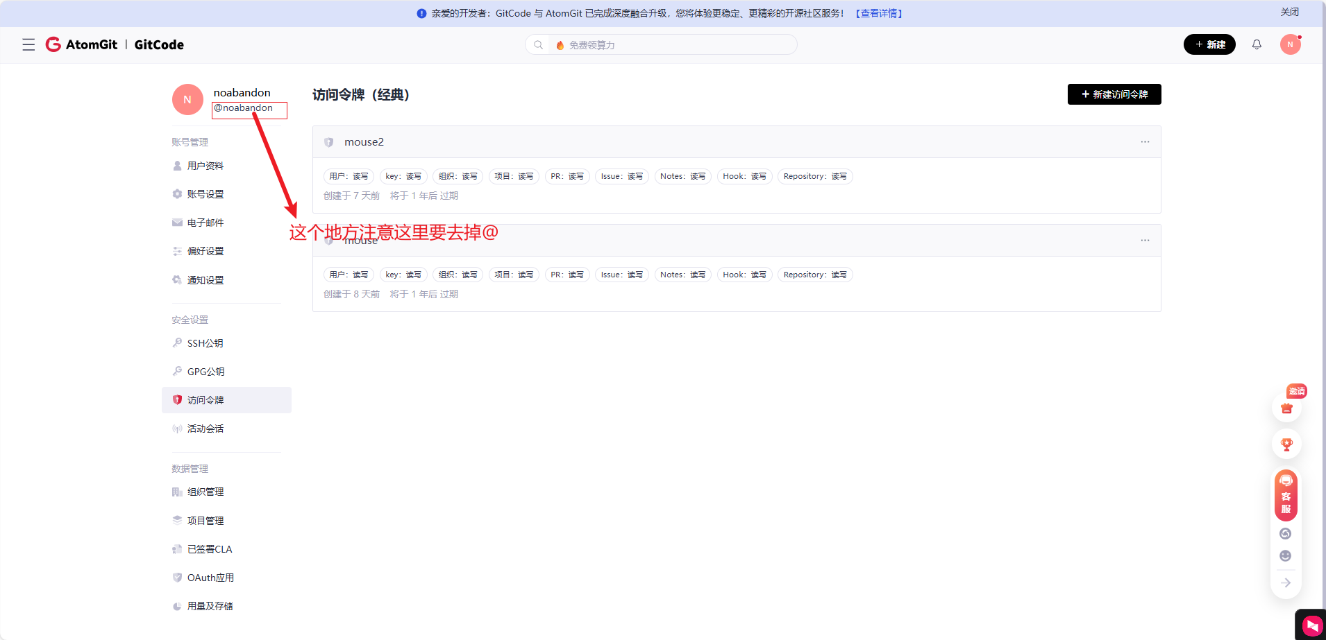 "noabandon"是我在Gitcode的id,可以改成你自己的,可以在上面这个网址查看。注意去掉@,去掉代码不会报错,但是接口访问会返回404.