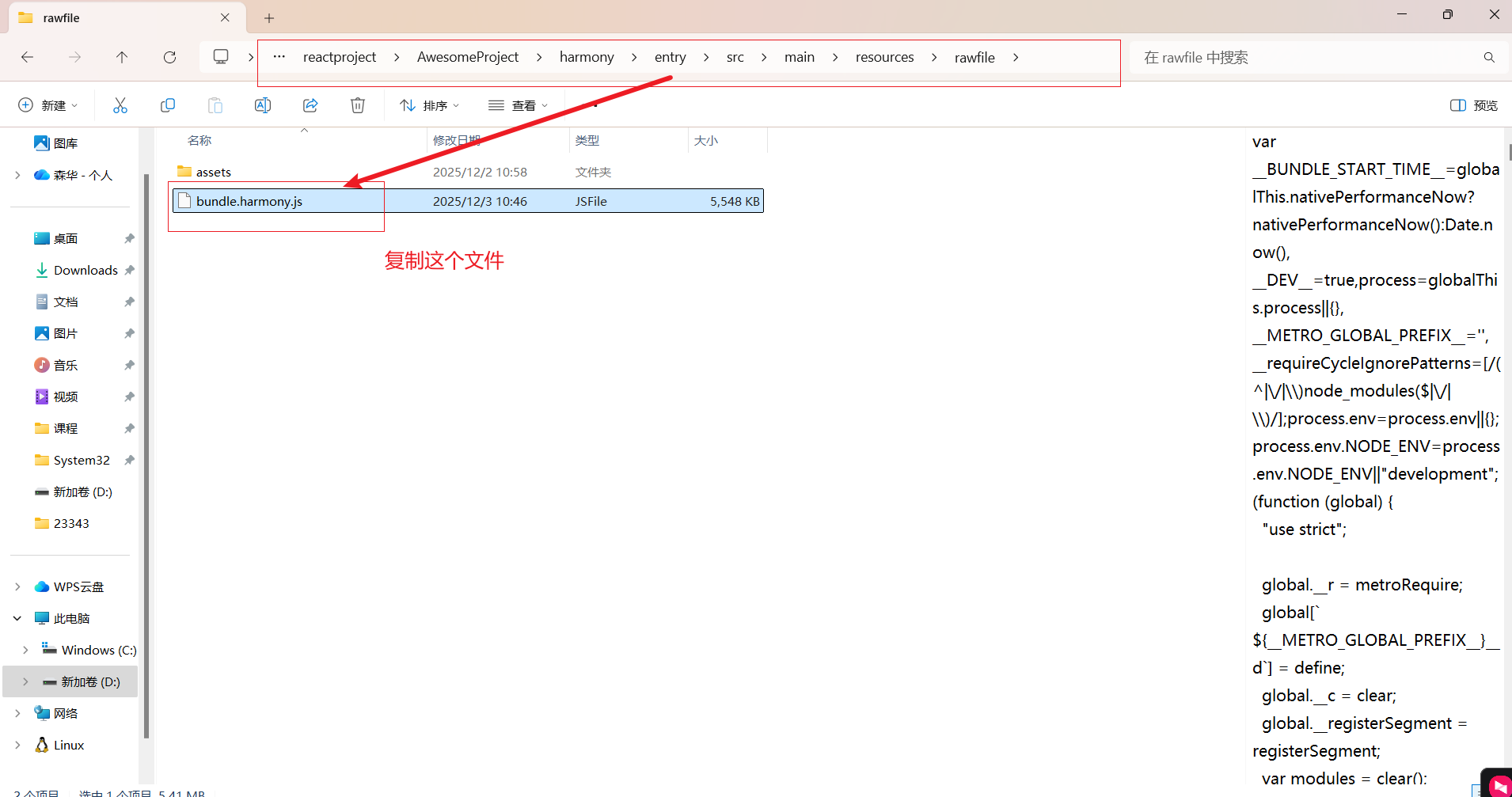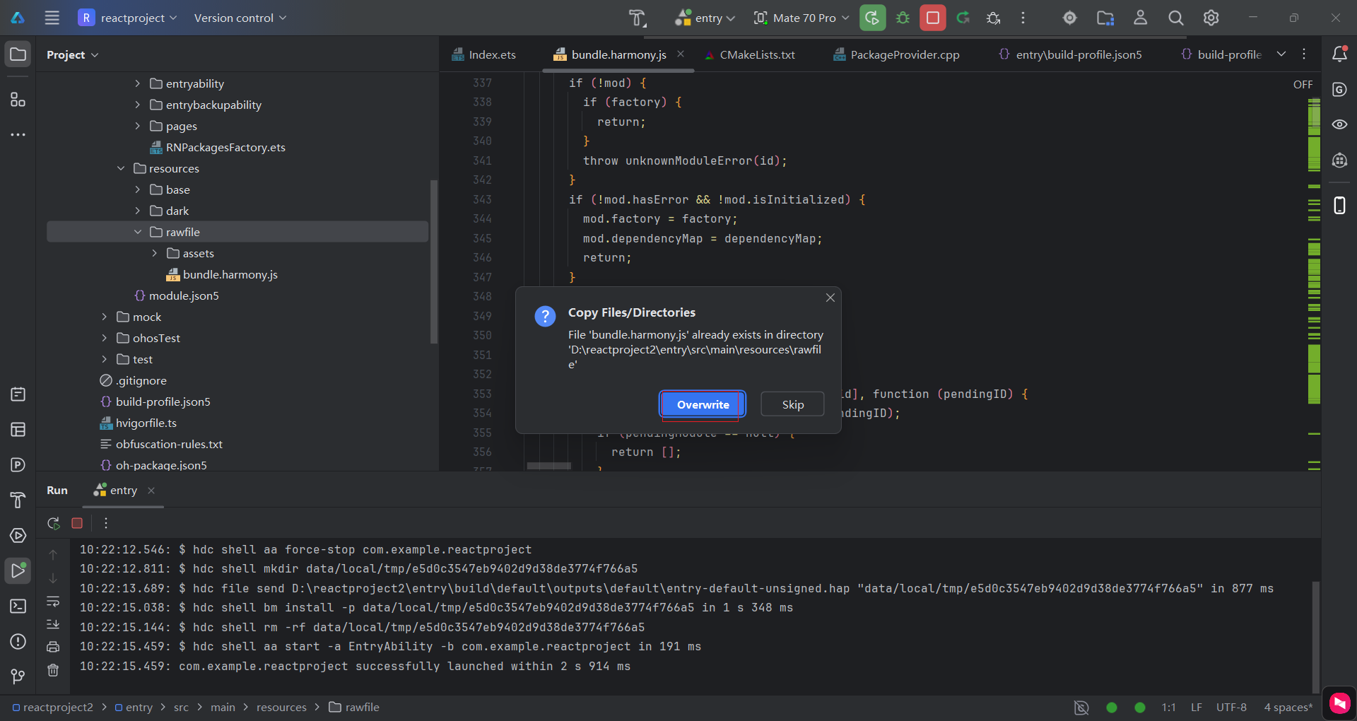 复制harmony\entry\src\main\resources\rawfile\assets文件夹下的"bundle.harmony.js"文件到DevEco Studio的rawfile\assets文件夹下,然后选择"Overwrite"覆盖原来的文件。