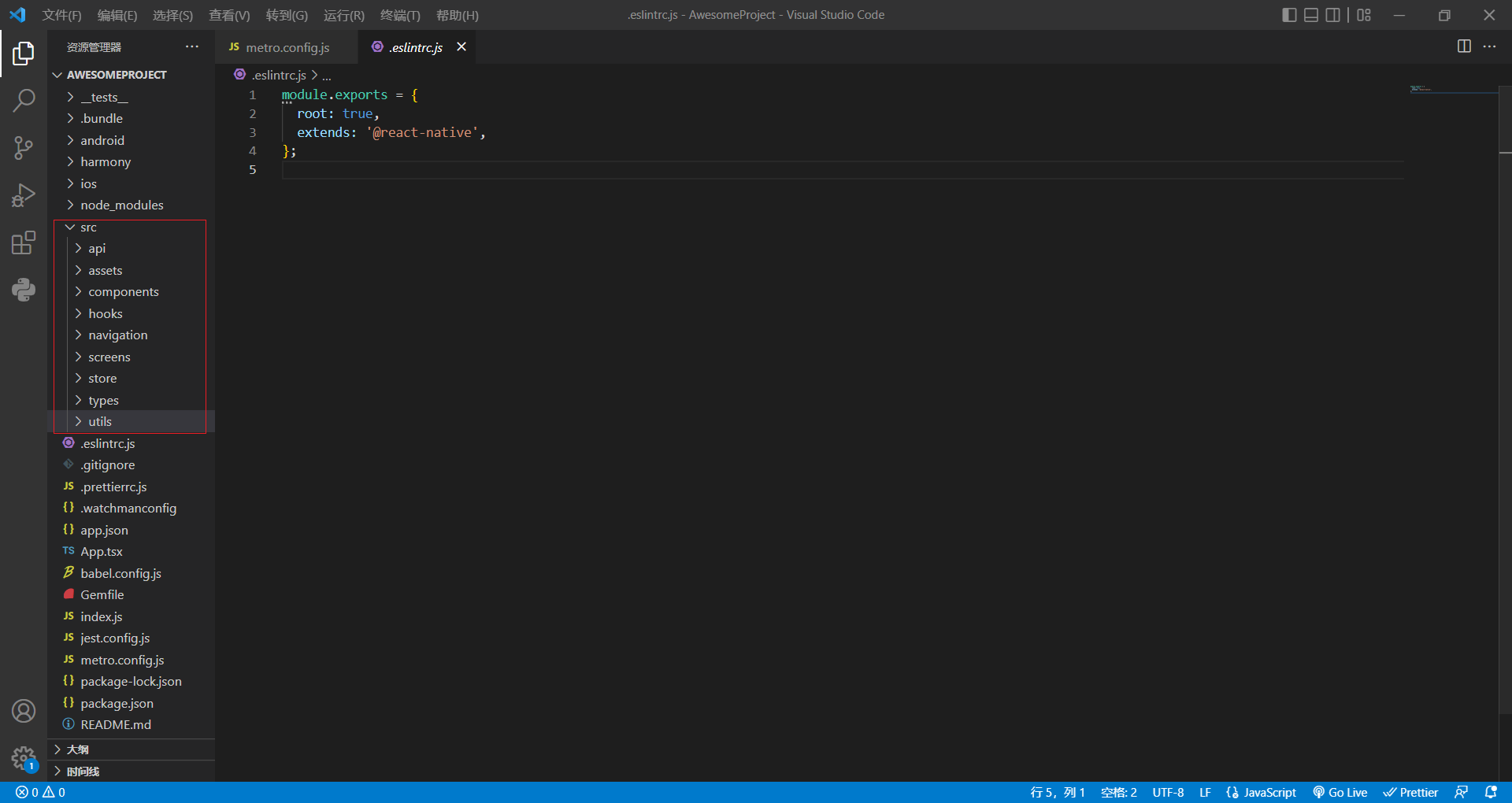 需要用到的文件夹:"AwesomePorject"。这个文件是我们从搭建React鸿蒙的环境得到的。如果不知道怎么搭建React鸿蒙环境的,可以查看下述链接。我们可以在vscode、trae、cursor打开该文件(注:DevEco Stduio无法打开这个文件)。本篇文章使用vscode,需要自己新建src文件夹,然后再在文件夹下新建"api"、"assets"、"components"等文件夹。