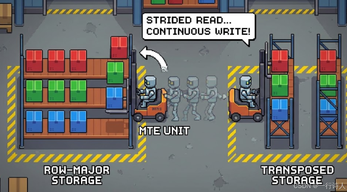 聪明办法:开一辆侧面开口的叉车(MTE),一次性铲起一列箱子,直接横过来放。这叫跨步搬运(Strided Copy)。