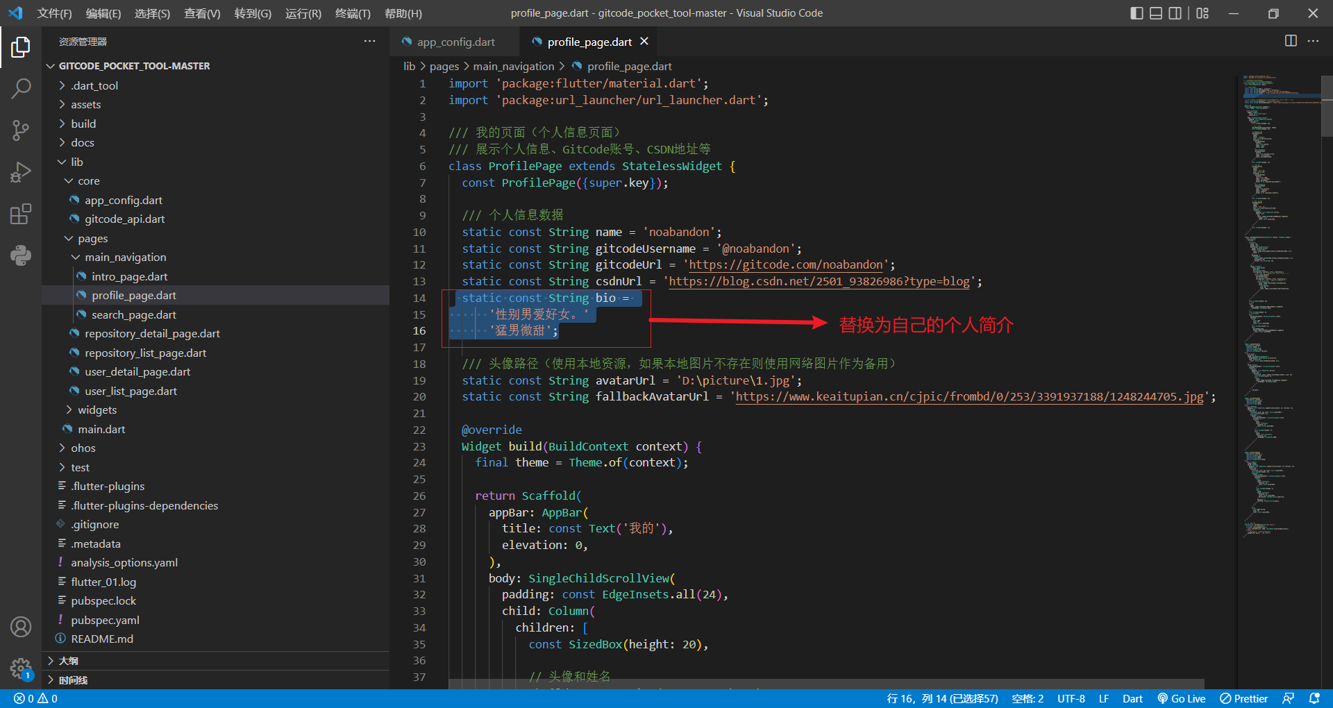 个人简介 :在 lib/pages/main_navigation/profile_page.dart:14~16 ,替换为自己的个人简介。
