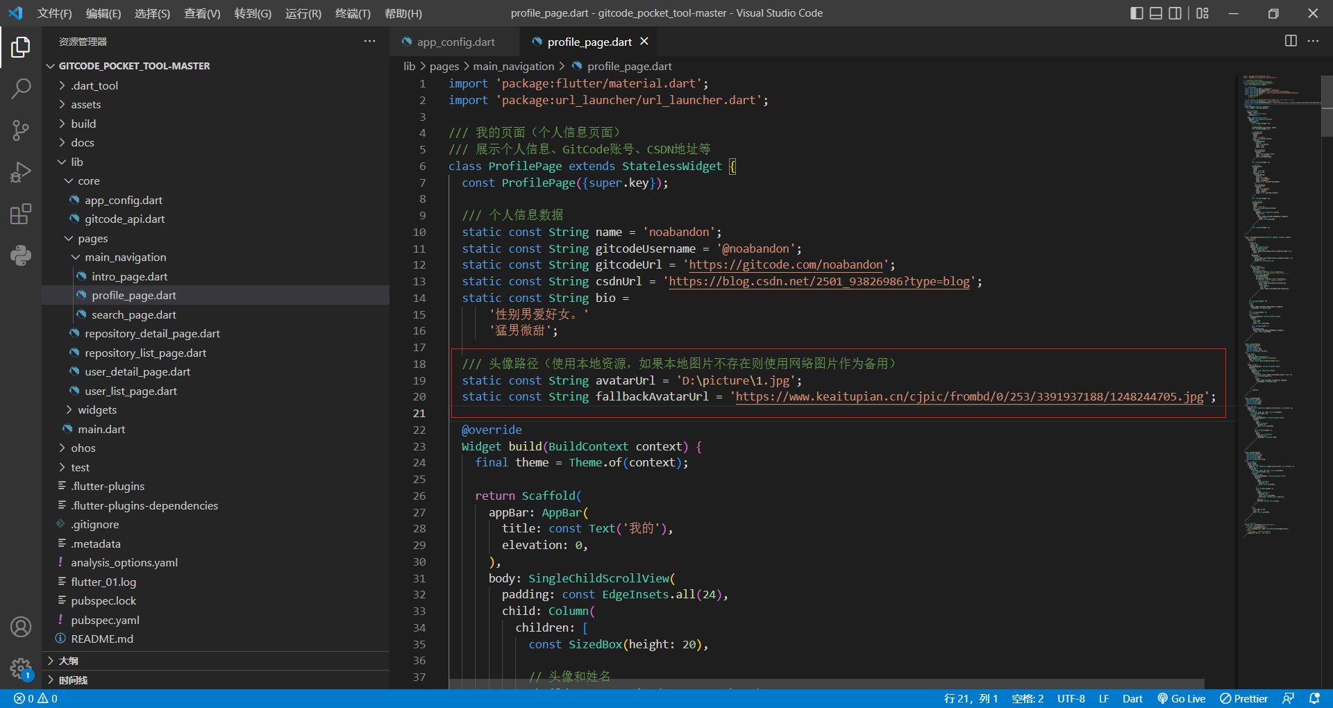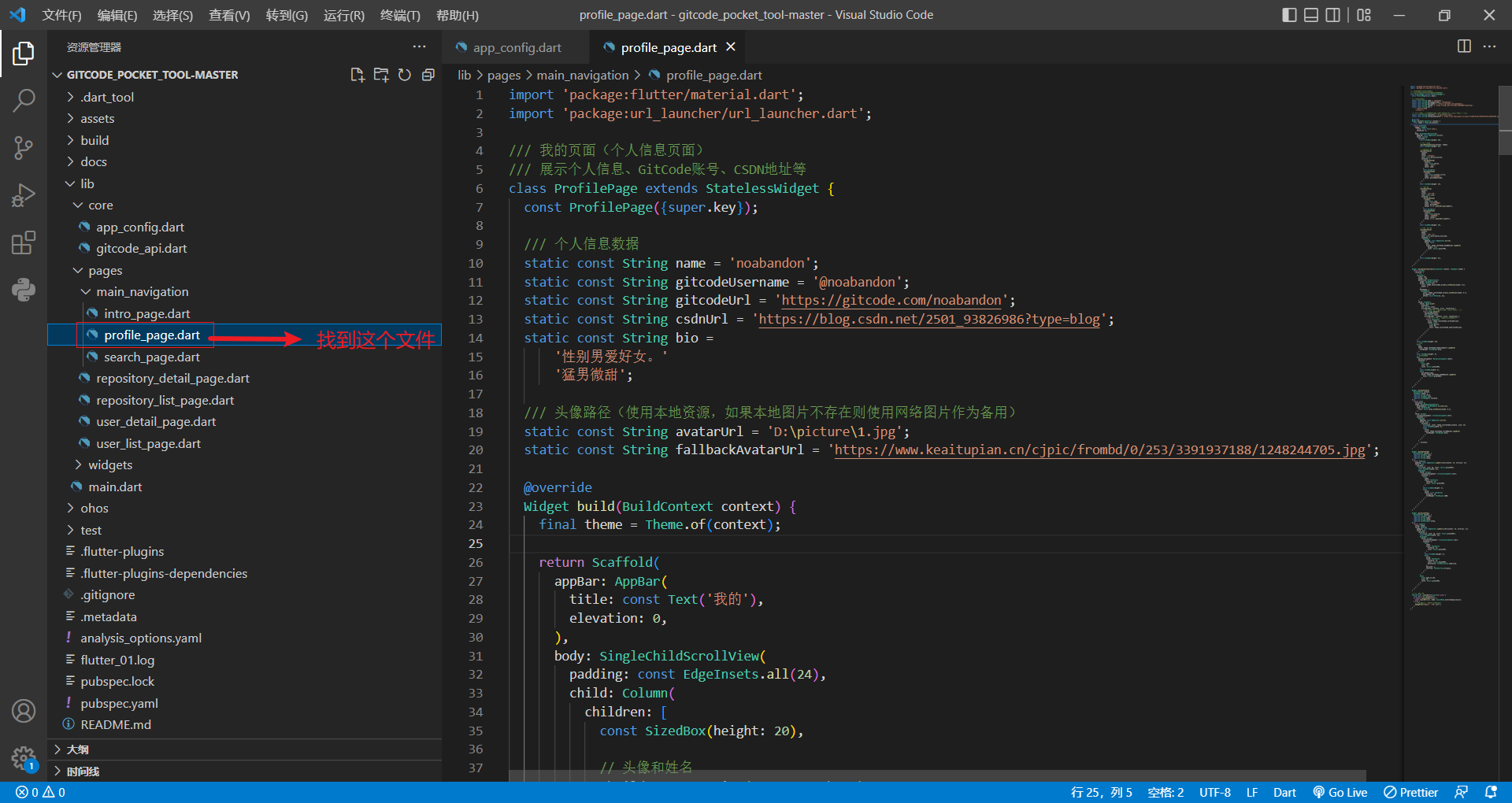 用vscode打开项目文件夹找到profile_page.dart文件