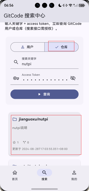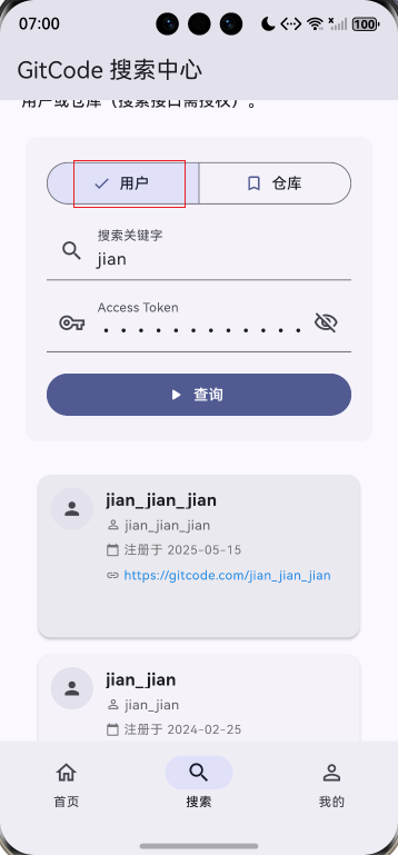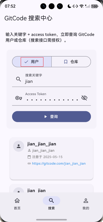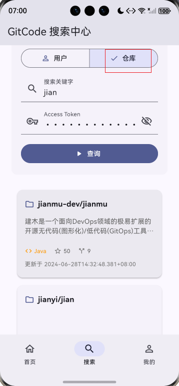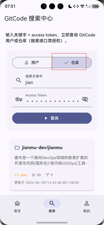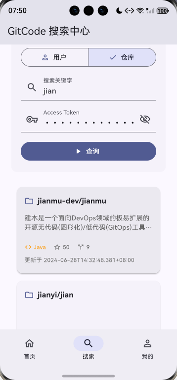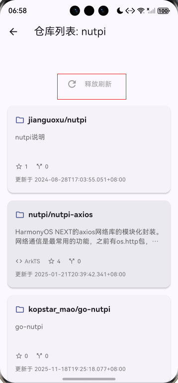 此项目基于上次的项目增加了自定义仓库列表卡片组件、自定义用户列表卡片组件、下拉刷新功能、上拉加载更多、数据分页管理。