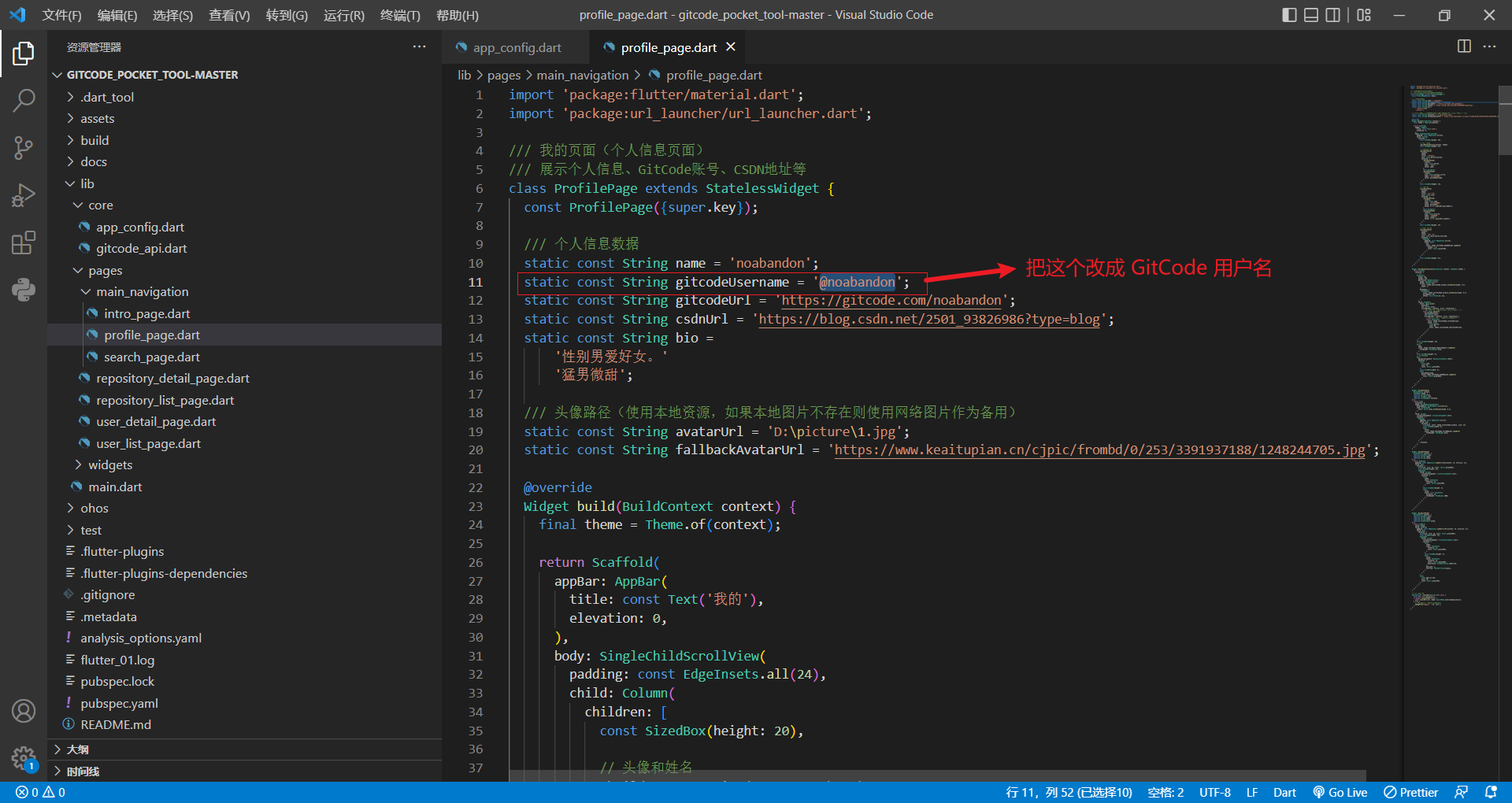 GitCode 用户名 :在 lib/pages/main_navigation/profile_page.dart:11 ,将 '@noabandon' 替换为自己的 GitCode 用户名。