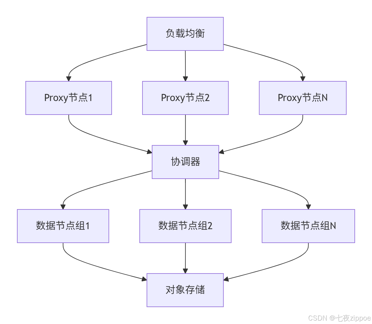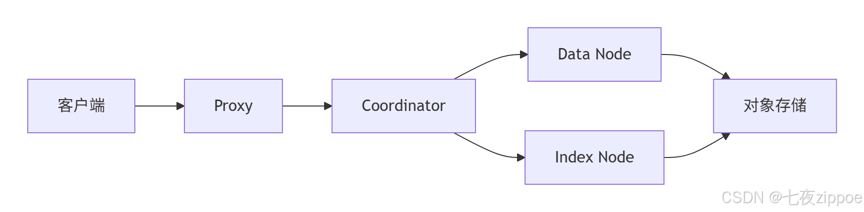 架构特点:专为超大规模向量搜索设计的云原生架构,组件包括Proxy、Coordinator、DataNode和IndexNode。