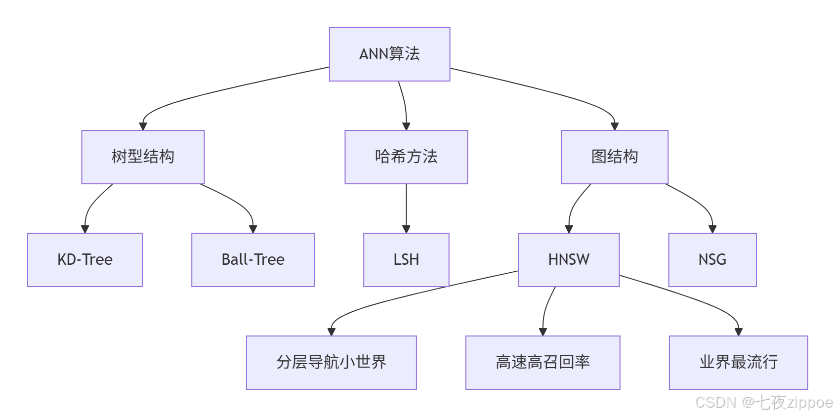 精确最近邻搜索在海量高维数据中计算成本极高,实际生产系统多采用近似最近邻算法。主流ANN算法对比: