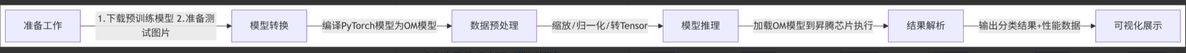 本次实战用经典的ResNet-50图像分类模型,实现"PyTorch模型→OM模型转换→数据预处理→推理执行→结果解析"全链路。OM模型是CANN的离线优化模型,经过图优化和算子融合后,性能远优于原生模型。