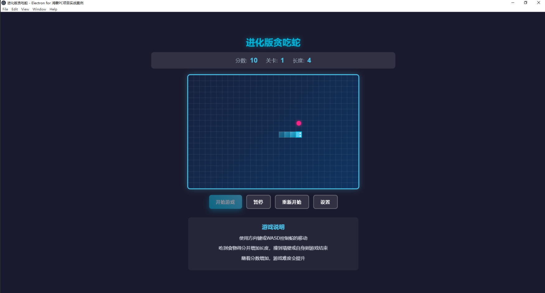 这是一款基于 Electron 开发的进化版贪吃蛇游戏,在经典玩法基础上融入关卡进阶、动态难度调整和特殊食物系统,通过 Canvas 绘图 API 实现流畅的游戏视觉体验。现已完成鸿蒙 PC 平台深度适配,借助 Electron 鸿蒙适配层实现跨平台无缝运行(支持 Windows/macOS/Linux/ 鸿蒙 PC),在完整保留原生核心功能的同时,针对鸿蒙 PC 系统特性优化了 Canvas 渲染性能、输入响应机制和窗口适配逻辑,完美贴合鸿蒙生态的操作习惯与硬件特性。