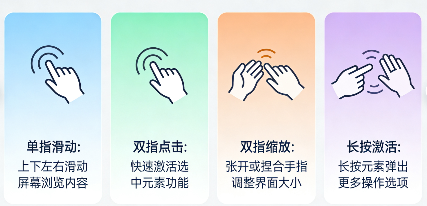 | 手势操作 | 双指滑动、捏合缩放、长按激活 | 替代触屏精准点击 |