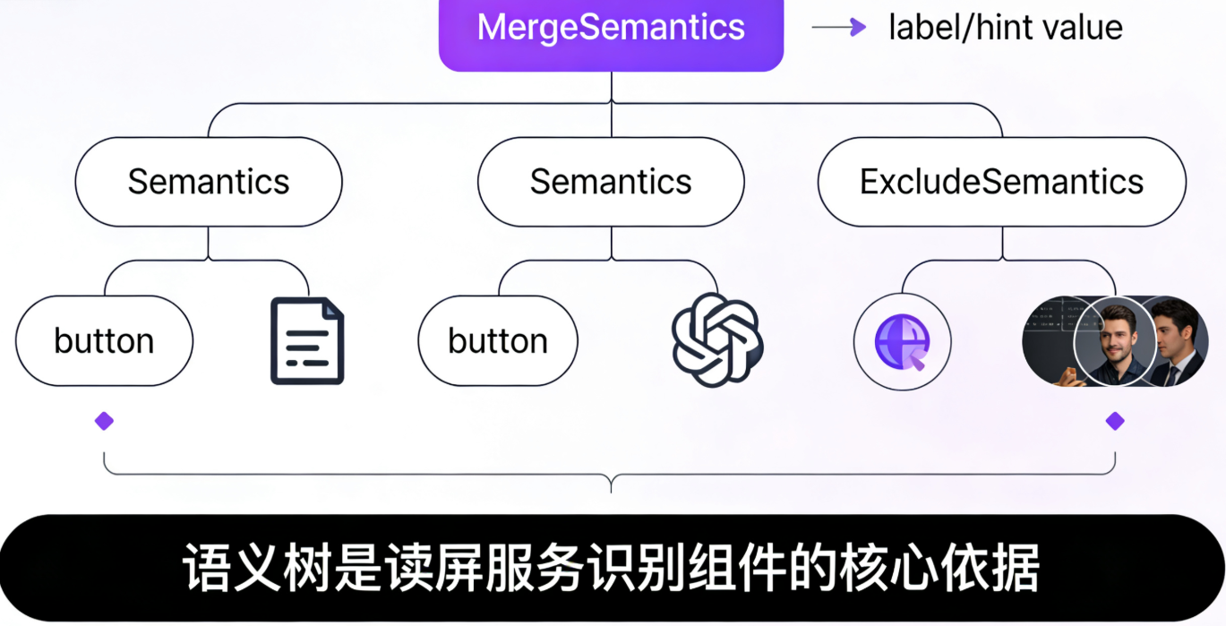Semantics 是 Flutter 无障碍的核心,用于为组件添加语义描述,鸿蒙读屏服务通过解析这些语义实现朗读。