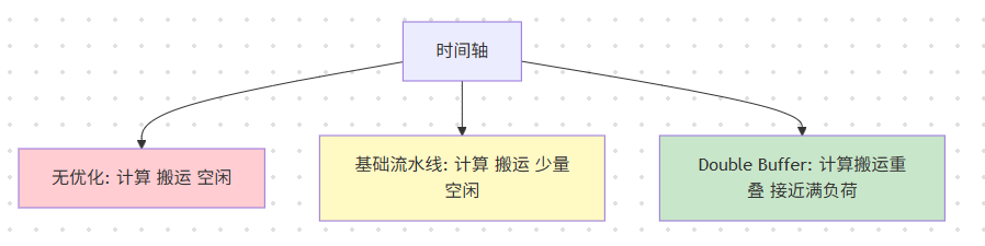 然而,简单串行执行这三个阶段会导致计算单元大量空闲。Ascend C通过Double Buffer技术实现计算与搬运的并行化。其工作原理如下: