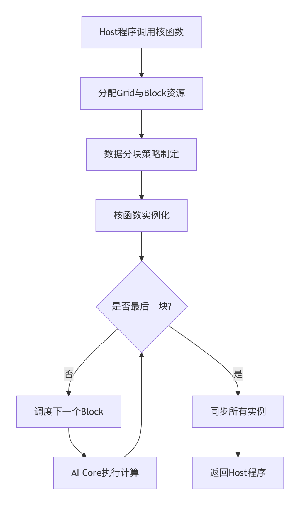 核函数的执行遵循网格-块模型(Grid-Block Model),但与CUDA有本质区别。如下流程图展示了Ascend C核函数的完整执行路径: