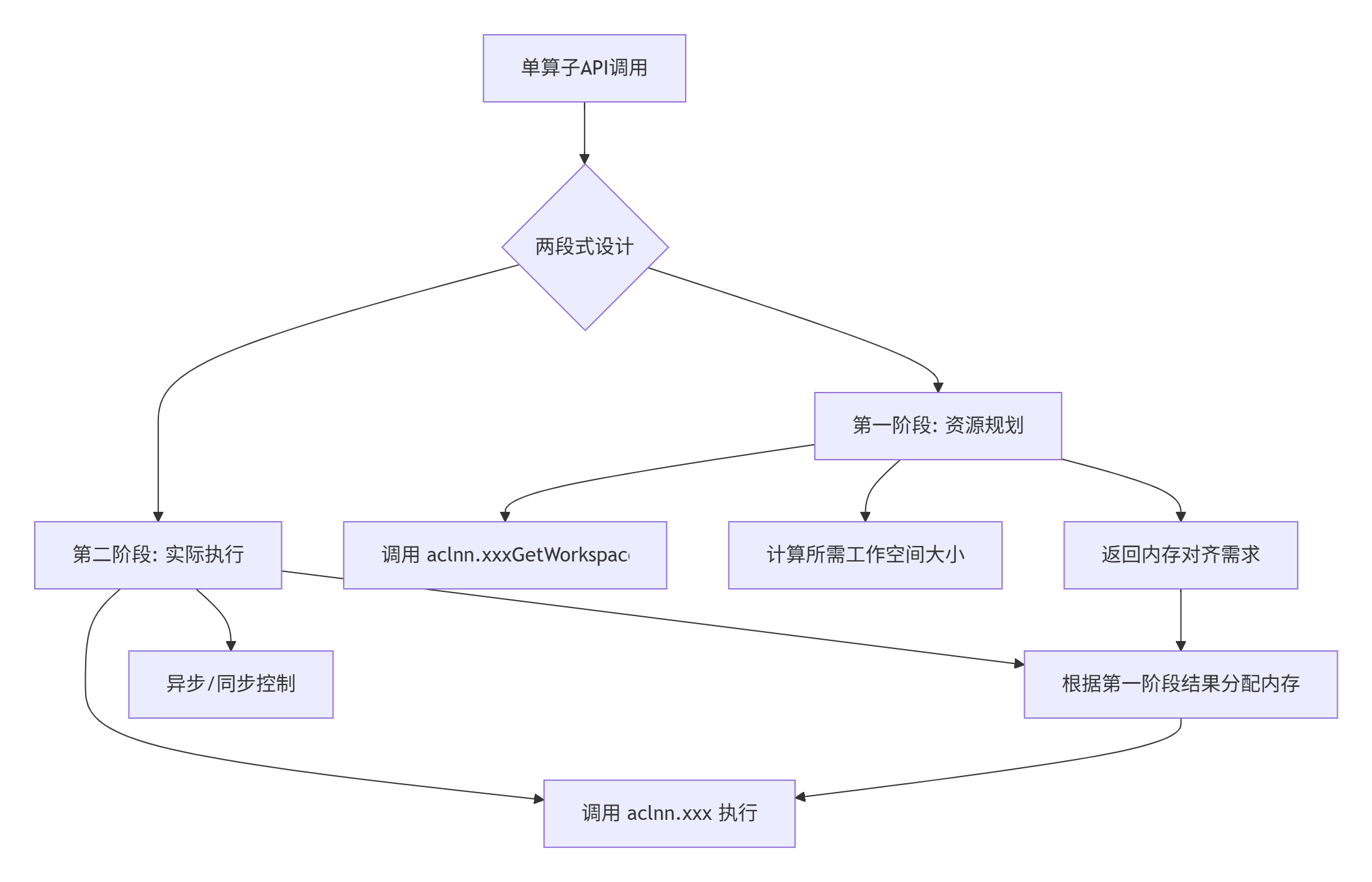 基于图片中的描述:"单算子API执行方式一般定义为'两端接口',通常aclnn.xxxGetWorkspaceSize为一段接口,主要用于计算本次API调用计算过程中需要多少的结内时间..."