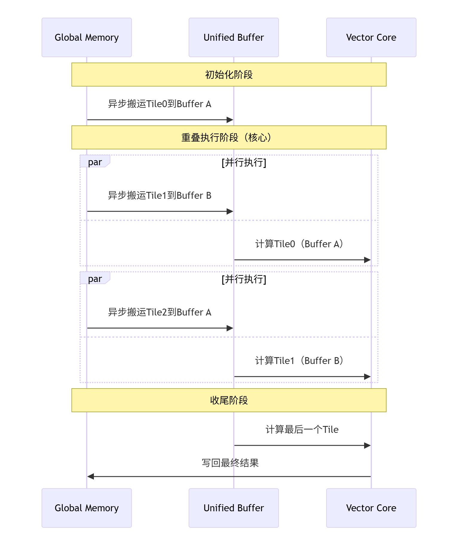 初始化阶段:在UB中分配两个等大的缓冲区(Buffer A和Buffer B)