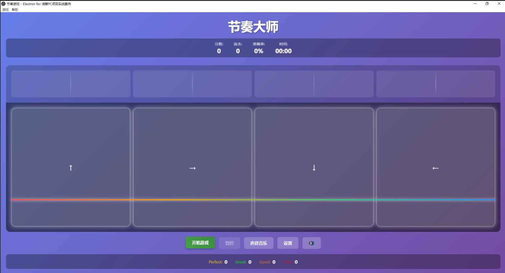 这是一个基于 Electron 开发的跨平台节奏游戏应用,玩家需根据音乐节奏按下对应方向键获取分数。本项目不仅展示了 Electron 环境下复杂游戏逻辑、动画效果与音效系统的实现,还新增鸿蒙 PC 平台专属适配改造方案,通过 Electron 鸿蒙适配层实现底层兼容,确保游戏在鸿蒙 PC 设备上具备稳定性能、原生交互体验与系统集成能力。