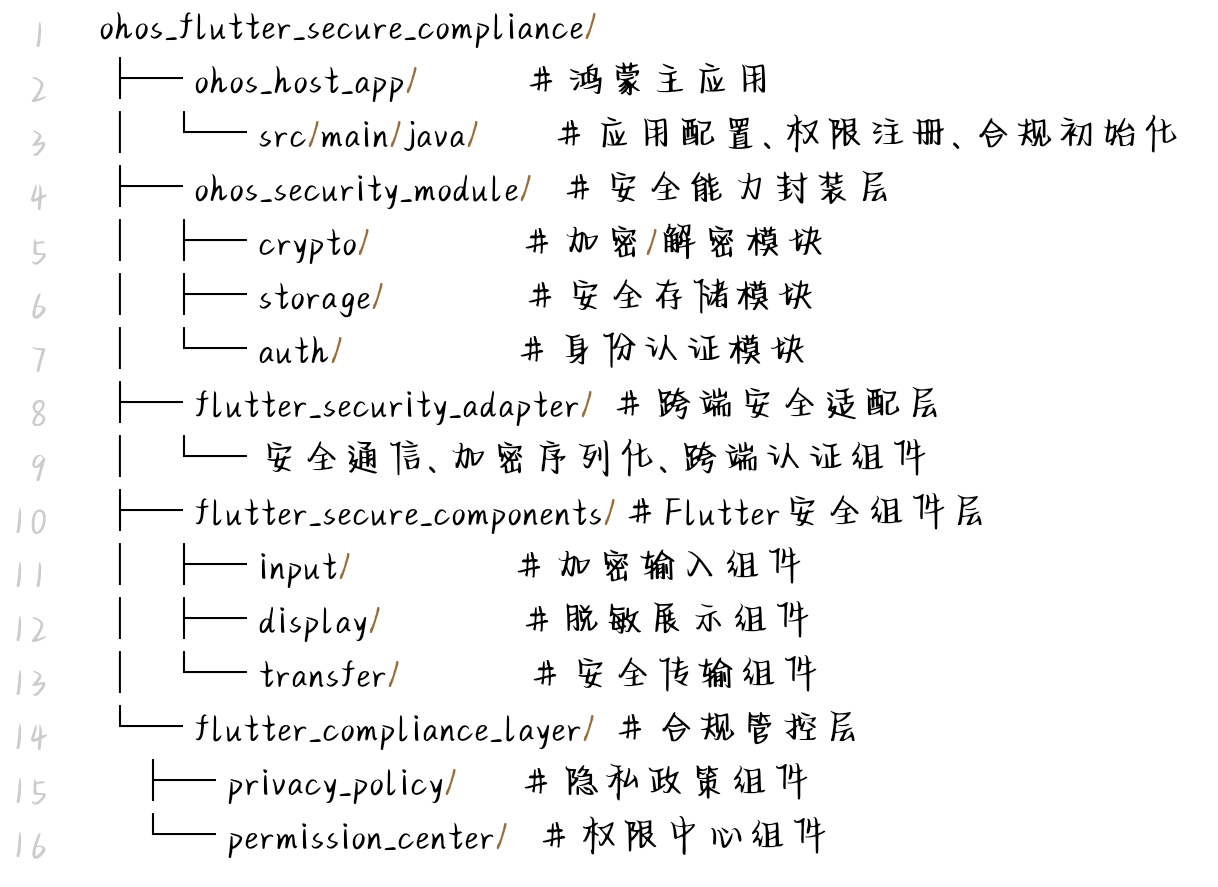 - Flutter:Flutter SDK 3.24.0+、flutter_secure_components: ^1.6.0、flutter_crypto_sm: ^1.2.0(国密算法适配)、flutter_permission_handler: ^10.5.0、flutter_compliance: ^1.1.0(合规组件);