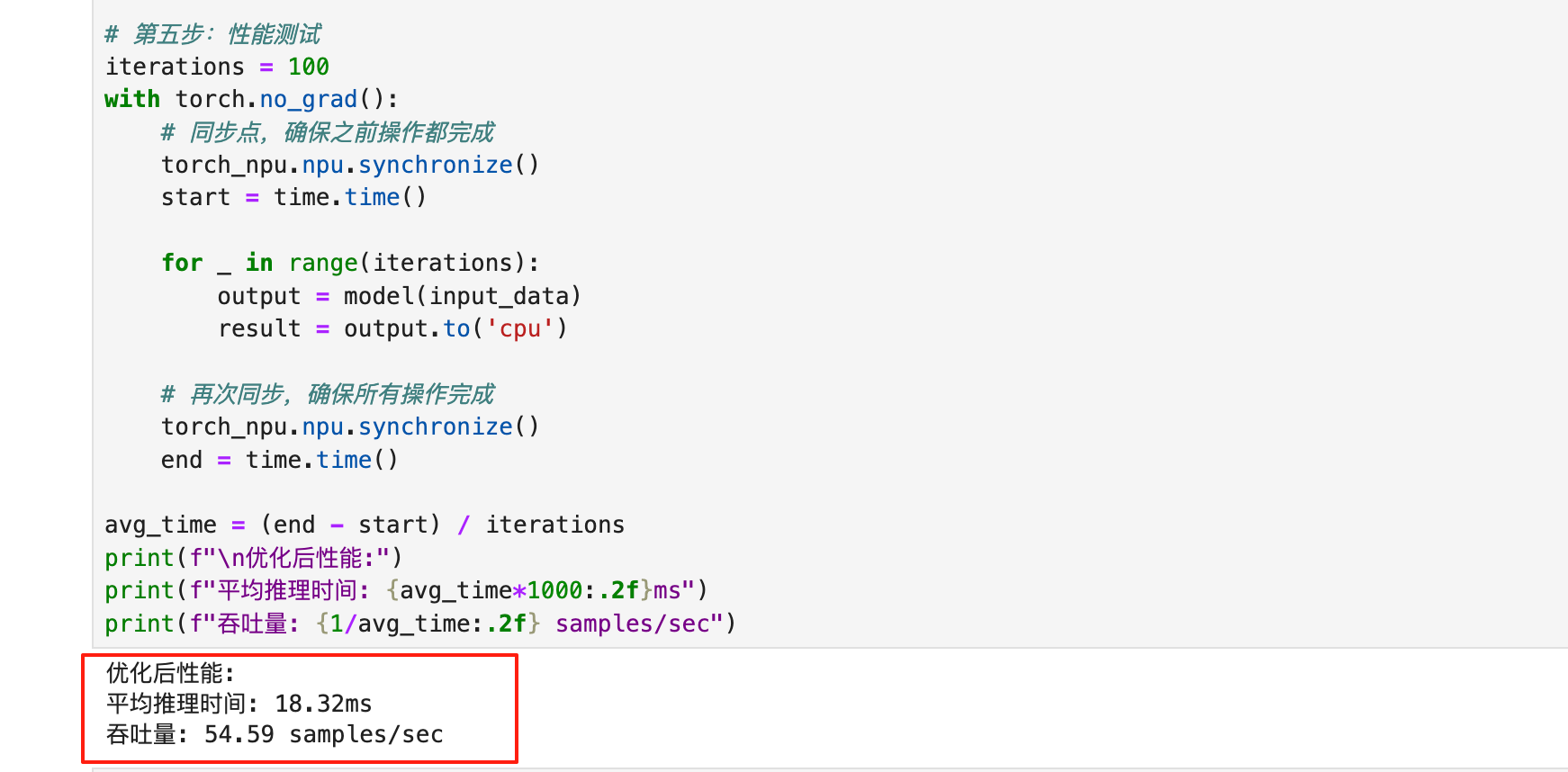 优化后性能中平均推理时间: 18.32ms,吞吐量: 54.59 samples/sec,这对比优化前的53.90ms,性能提升了约65%。同时为了更好的对比,在同一台910B机器上,我运行了优化前后的对比脚本,结果非常惊人。