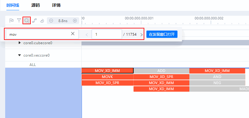 - 单击时间线(Timeline)界面树状图或者图形化窗格任意位置,可以使用键盘中的W(放大)和S(缩小)键进行操作,支持放大的最大精度为1ns。