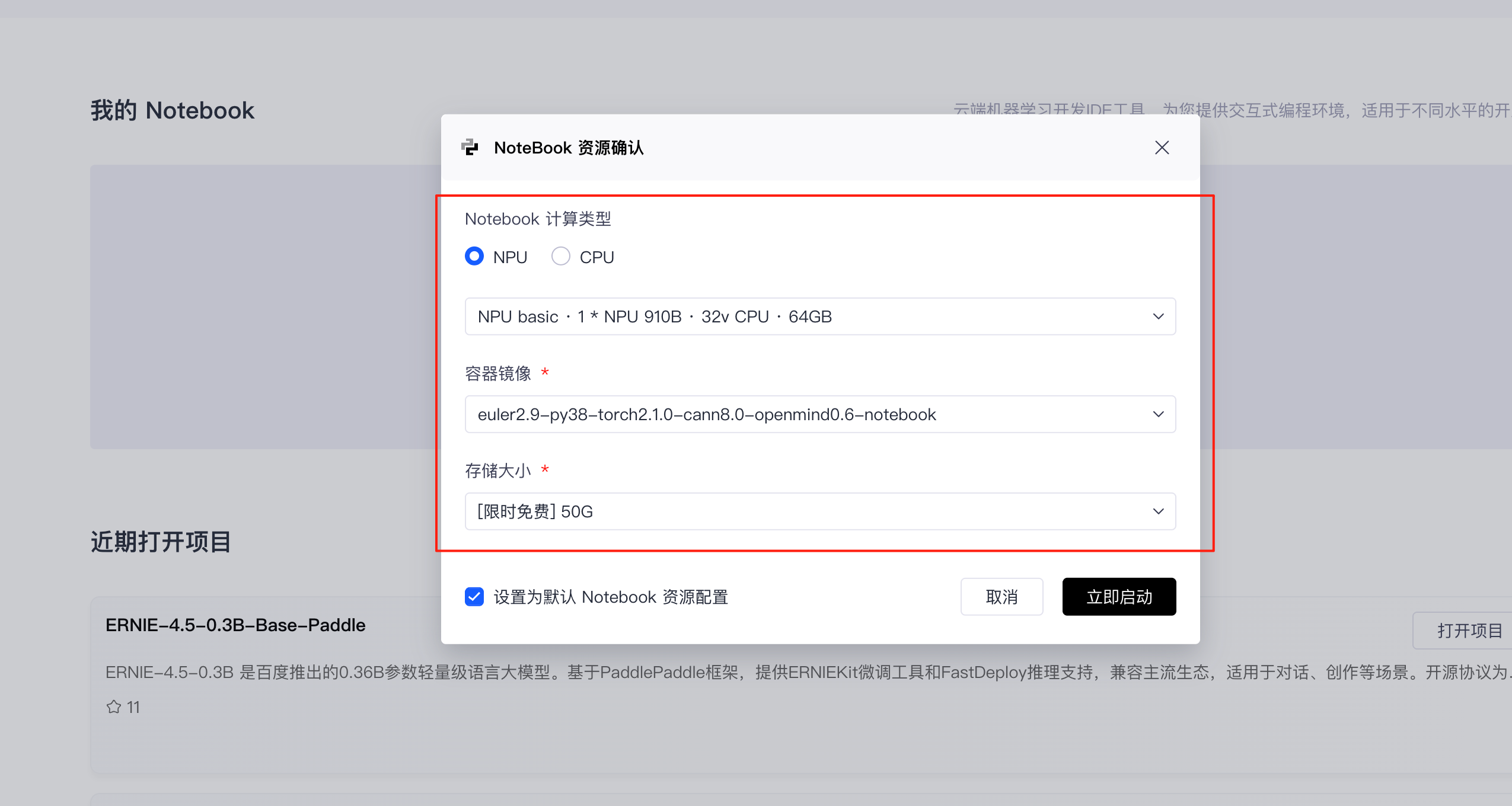 点击上方的 “Notebook 工作区”,进入你的云端开发环境管理页面,首次使用会提示激活,直接确认开通即可:
