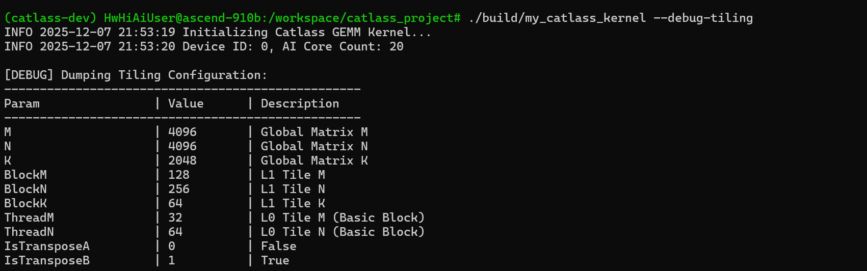 建议在 Host 端的 Tiling 函数中增加 Debug 开关,打印出计算出的所有 Tiling 参数: