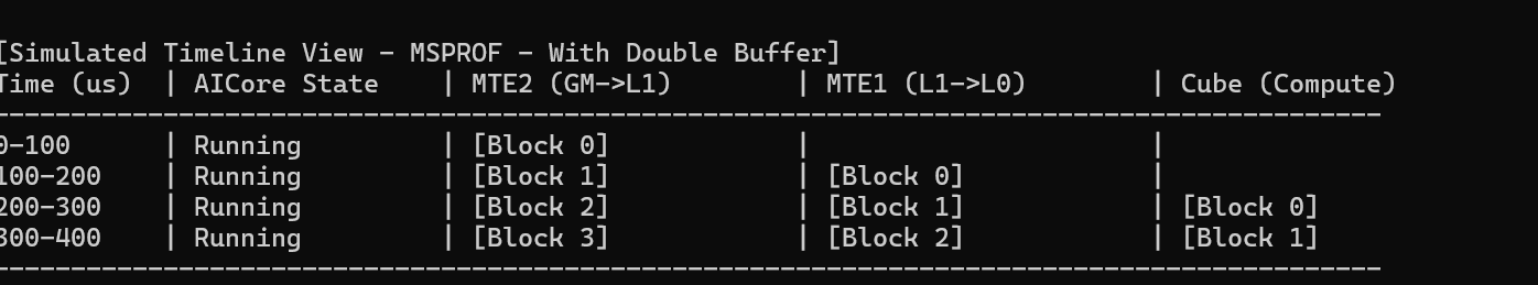 经过 Double Buffering 优化后,Timeline 应该是紧凑的,计算和搬运完美重叠。