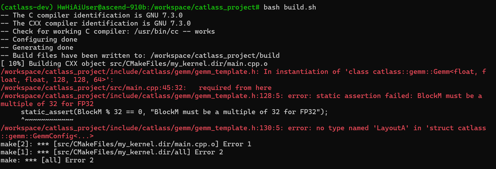 Catlass 为了极致的性能,使用了大量的 C++ 模板元编程技术。这导致的一个直接后果是:报错信息极长且难以理解。