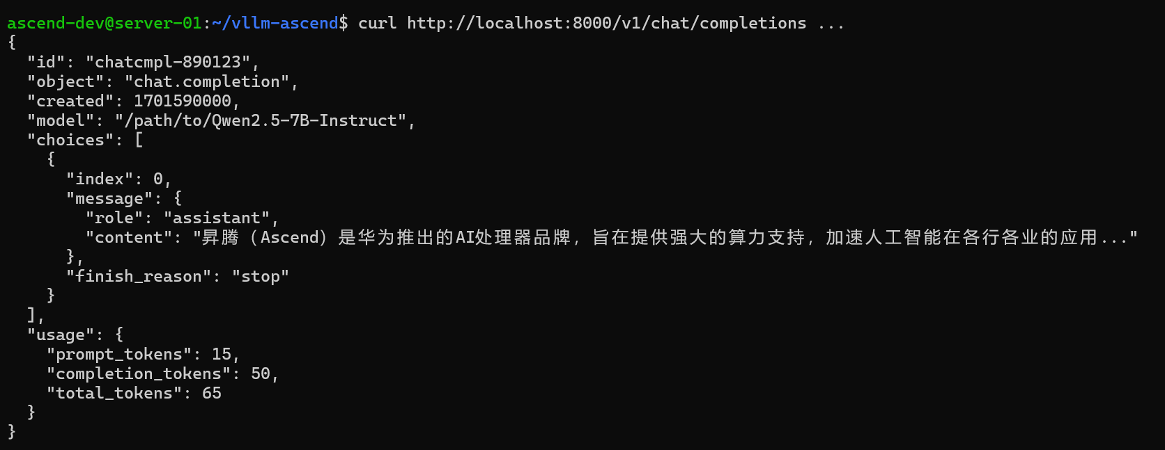 vLLM 提供了兼容 OpenAI API 的服务化启动方式,这也是生产环境中最常用的模式。通过这种方式,我们可以把本地模型部署成 API 服务,外部程序只需要通过 HTTP 请求就能调用模型生成文本。这种服务化方式不仅方便在生产环境中集成,也便于多用户并发访问,充分发挥 NPU 的算力优势。
