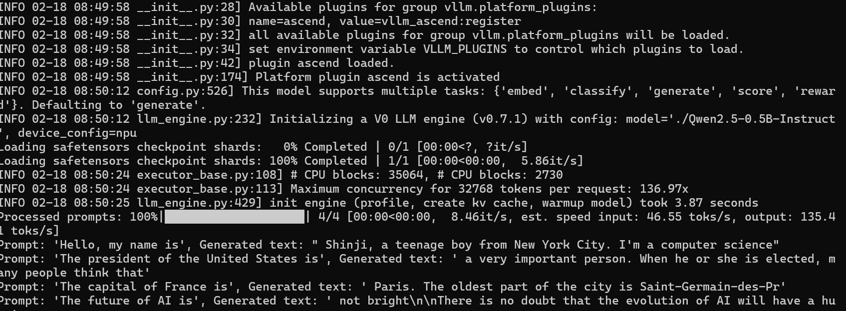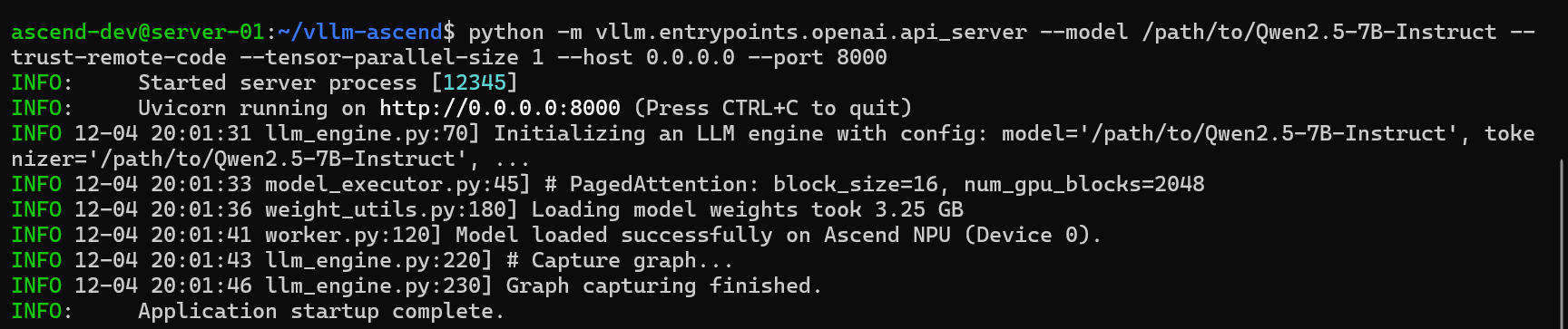 # INFO 12-03 10:00:10 worker.py:120] Model loaded successfully on Ascend NPU (Device 0).
