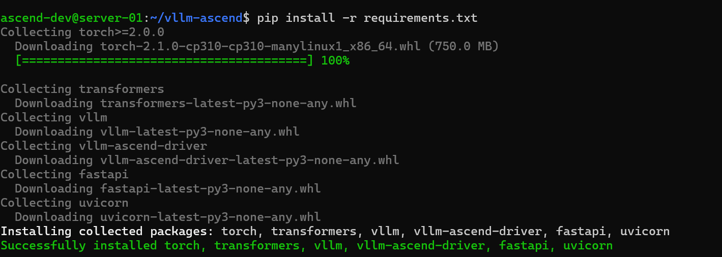 安装完成后,vLLM-Ascend 已经在昇腾 NPU 上顺利搭建好运行环境,接下来我将带大家进行模型加载、推理服务化以及性能调优的实战操作,让大家能够快速将本地模型变成可调用的 API 服务。