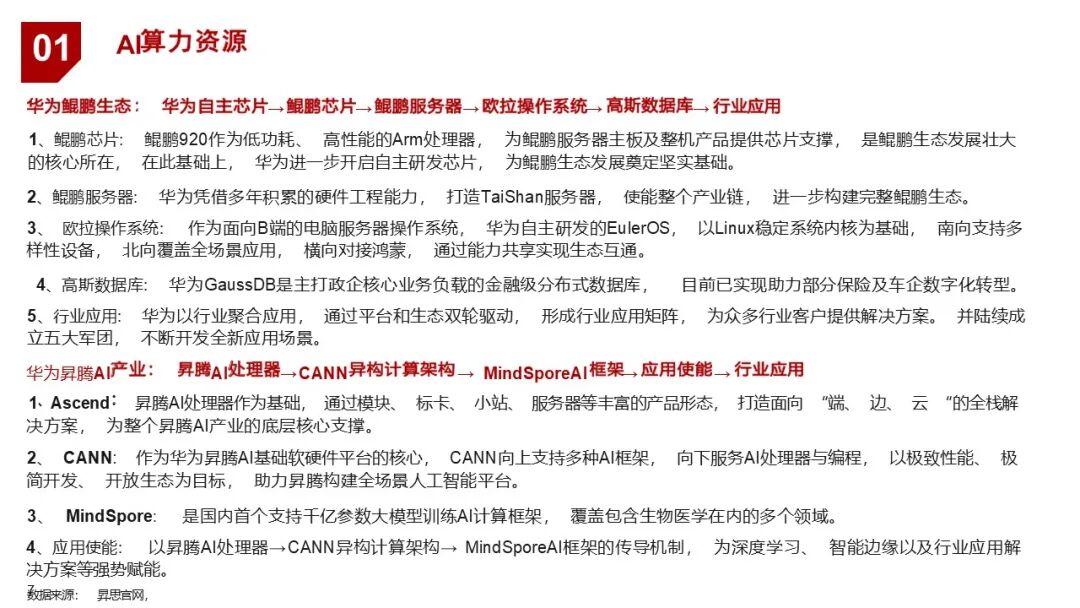 | 1. 算力层 | 昇腾(Ascend)+ 鲲鹏(Kunpeng) | 提供AI训练与推理所需的强大算力支撑,支持端-边-云全场景部署 |
