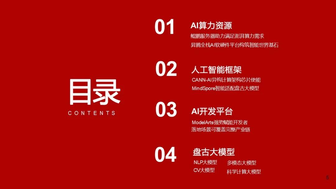 | 4. 模型层 | 盘古大模型(NLP/CV/多模态/科学计算) | 面向行业落地的大模型,具备小样本学习、微调能力强、跨模态理解与生成能力 |