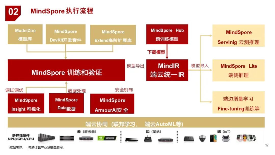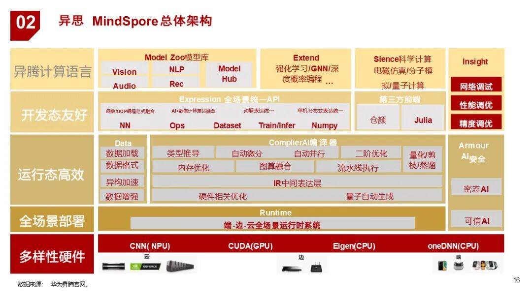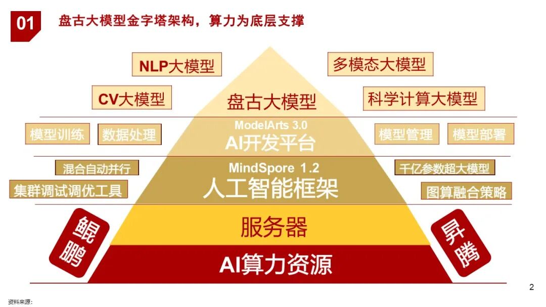 | 2. 框架层 | MindSpore | 国内首个支持千亿级参数大模型训练的AI框架,支持自动并行、图算融合等高效训练机制 |