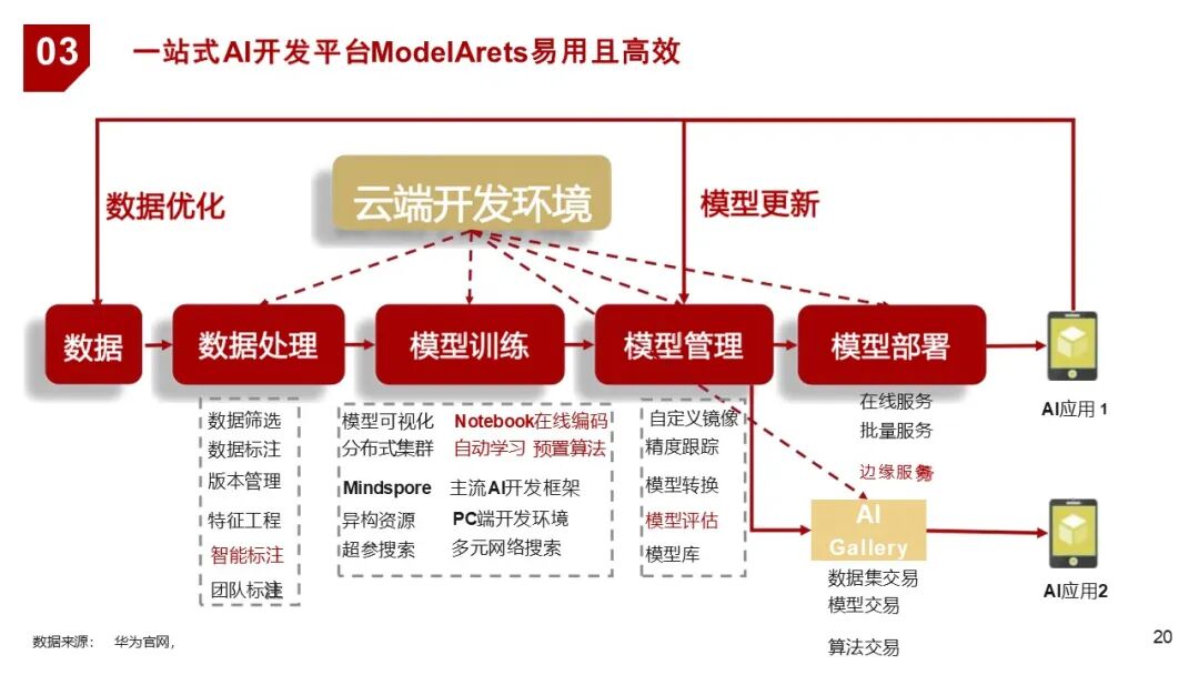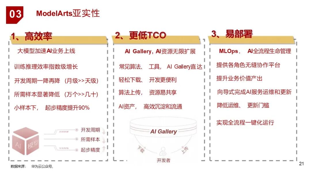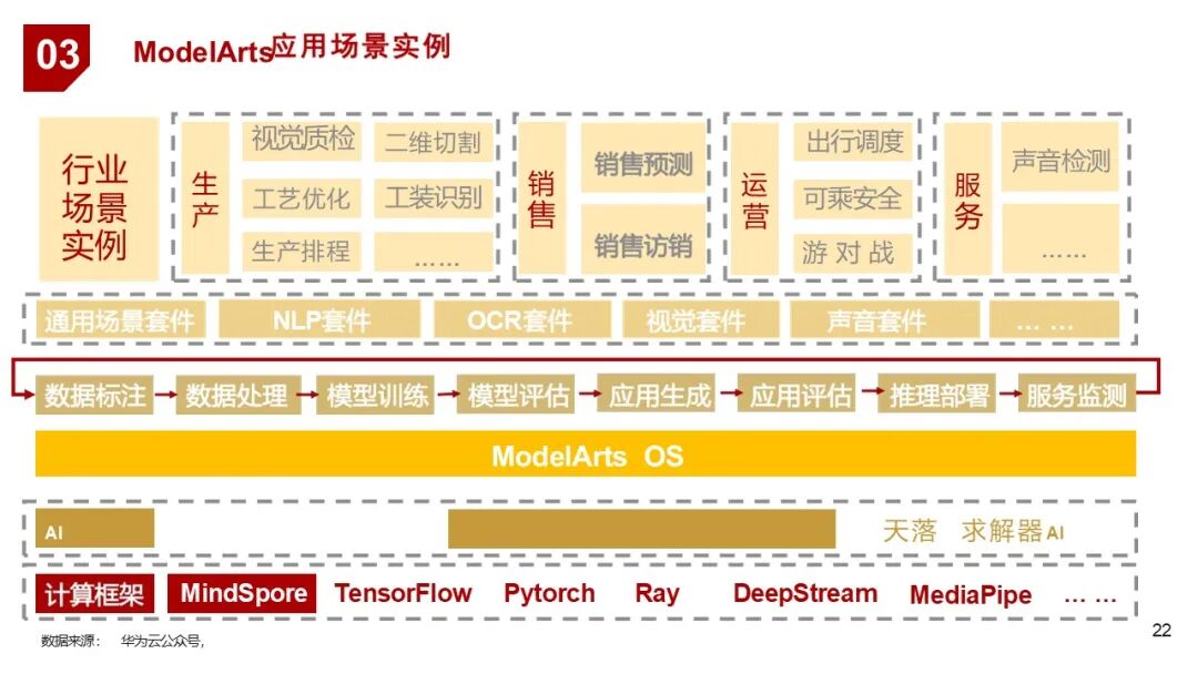 | 3. 平台层 | ModelArts | 提供从数据处理、模型训练、部署到运维的全流程AI开发平台,支持MLOps、分布式训练、自动学习等 |
