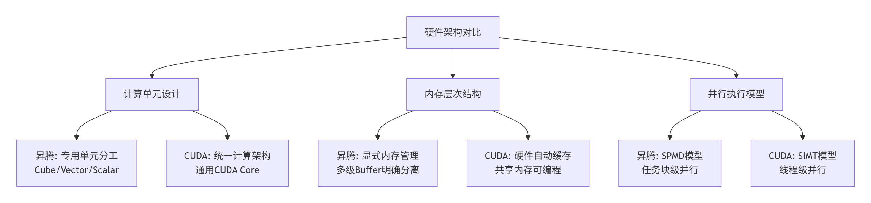 相反,CUDA的SIMT模型以线程(Thread)为基本单位,开发者需要管理大量细粒度线程的协作。这种模型提供极大灵活性,但增加了编程复杂度。实际表现为:Ascend C开发者思考“如何将问题分解为块”,而CUDA开发者思考“如何为每个线程分配工作”。